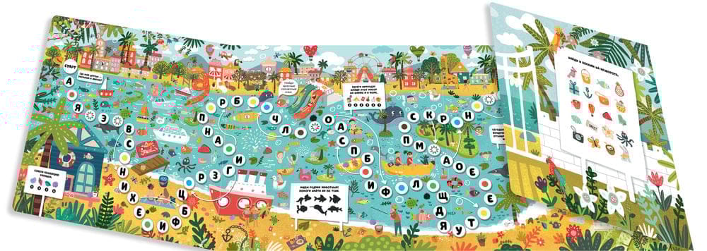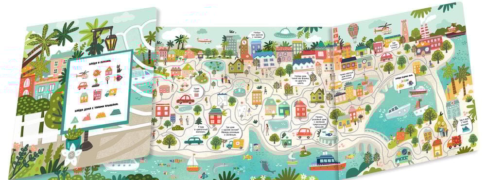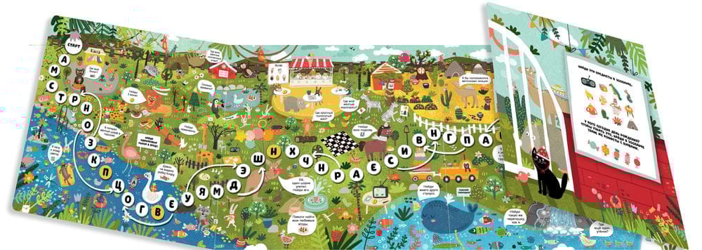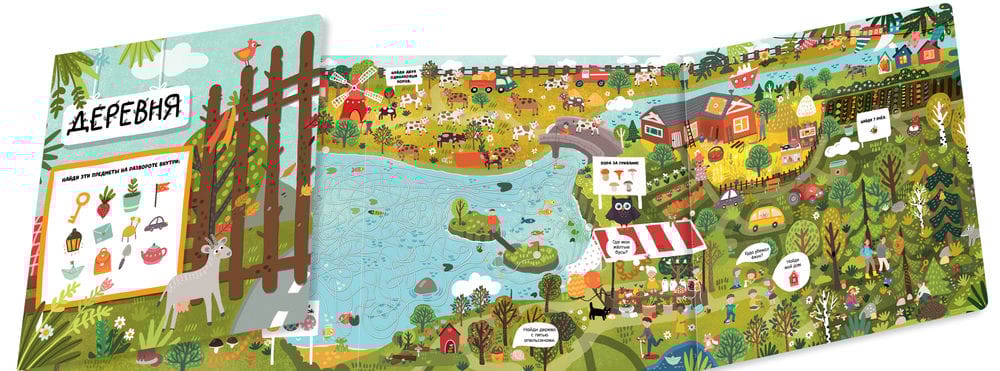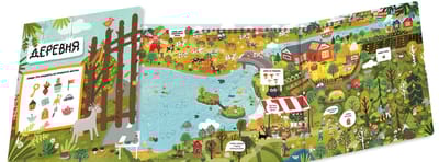"Giant Book of Find and Show" is a fold-out book with colorful panoramic pictures. Each spread is a whole meter of games and fun tasks. We will go on a walk to the village, the city, the zoo, the seaside and even to the land of fantasy!