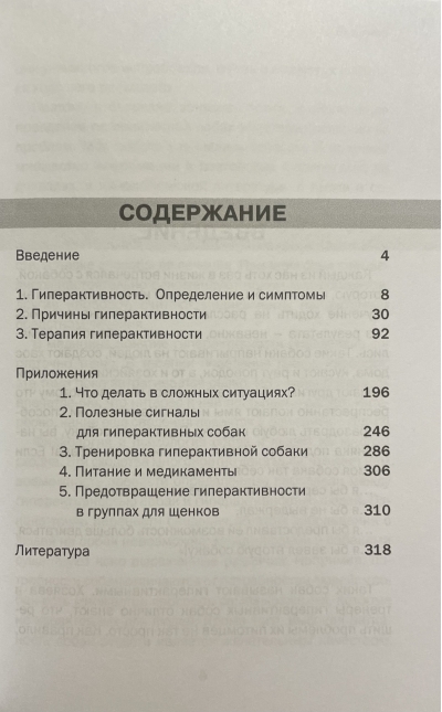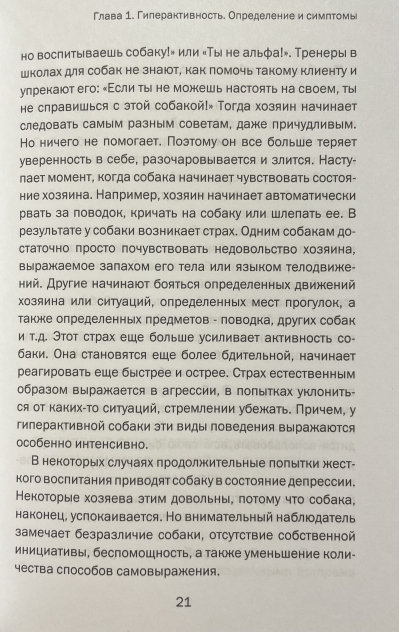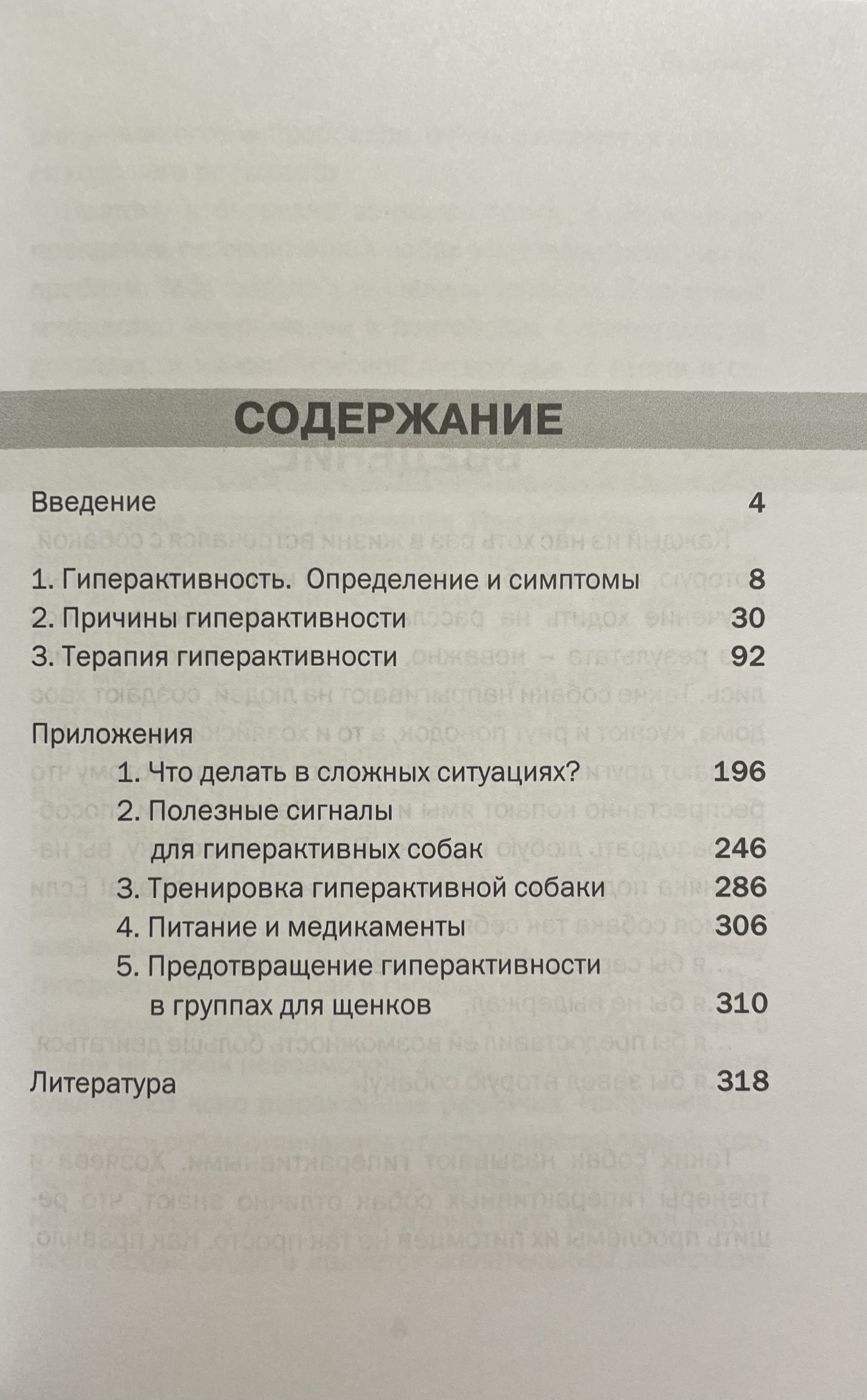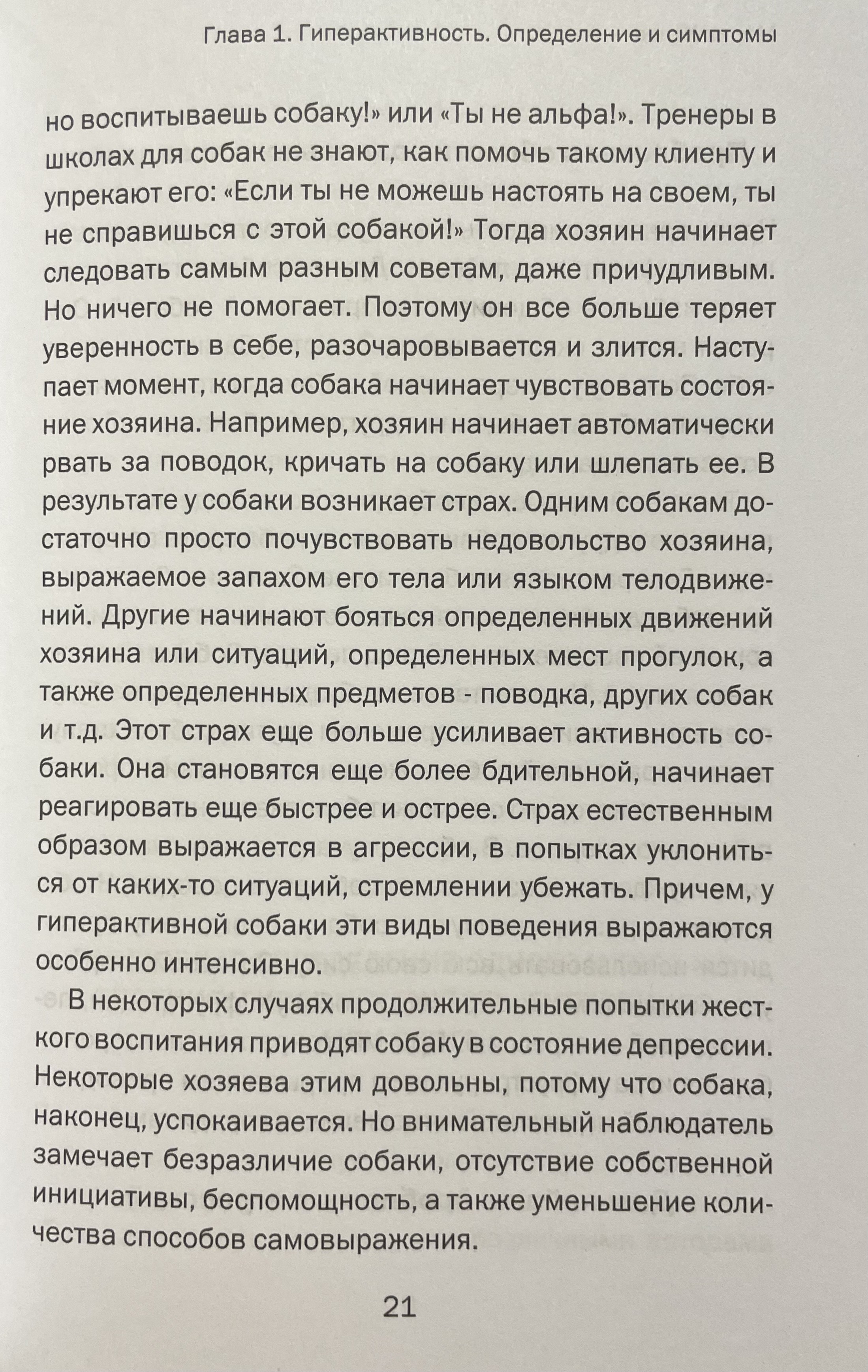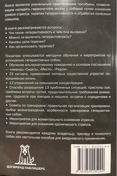 This book is a unique practical guide for creating a harmonious life with your dog by reducing stress, treating hyperactivity, and developing useful skills. The book addresses the following questions: What is hyperactivity and what causes it? Can hyperactivity be cured? What are the goals of therapy? How do you organize therapy? It describes step-by-step training methods and measures for calming hyperactive dogs: Teaching alternative behaviors and basic obedience - the commands "Sit," "Stay," and "Heel." 23 signals, the use of which will significantly simplify everyday life. 12 exercises to improve concentration. Methods for resolving 13 problematic situations: barking fits, problems greeting guests, prolonged demands for attention, difficulties traveling in the car, meeting other dogs, and others. Training tips: proper organization of training, choosing a reward, the specifics of training hyperactive dogs. Measures for immediate stress reduction. Measures for reducing chronic stress. This book is recommended for every dog owner, trainer and psychologist as a reference book for daily use.