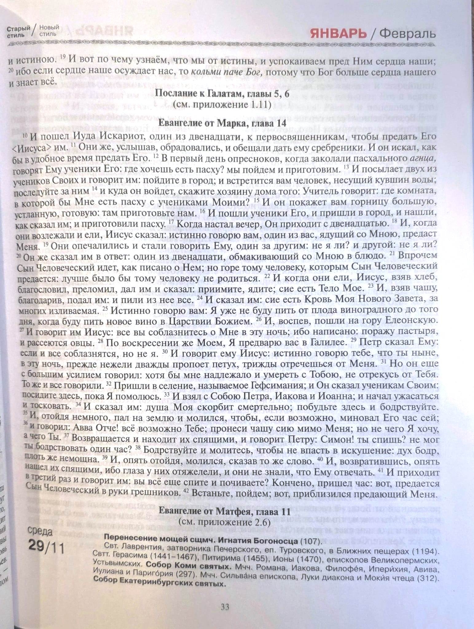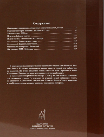 In everyday life, Christians need to read the books of the New and Old Testaments. They can be read sequentially, chapter by chapter, or selectively, as desired. However, it is better to read daily, together with the entire Church, those passages of Holy Scripture that are proclaimed in the churches of God. The Orthodox Church Calendar, "Listening to the Word of God," includes selected texts from the Gospel and Epistle for each day for home reading (translated into Russian). Chapters from the Old Testament are included for the days of Great Lent when the Liturgy is not celebrated.
