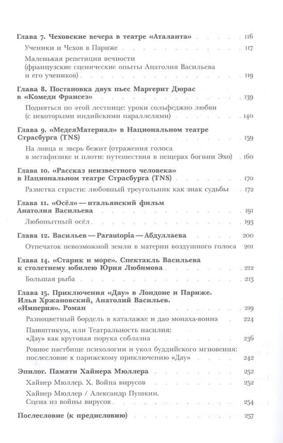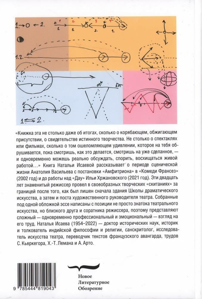"This book isn't so much about results as it is about a gnawing, searing presence, a testimony to true creativity. It's not so much about performances or films, but about the stunning wonder that befalls you while you're watching it being done, looking at what's already been accomplished—and at the same time, you can actually discuss, debate, and admire the living work..." This book by philosophy historian, translator, and theater scholar Natalia Isaeva chronicles Anatoly Vasiliev's stage career, from his production of "Amphitryon" at the Comédie-Française (2002) to his work on Ilya Khrzhanovsky's "Dau" (2021). The renowned director spent these twenty years in a kind of creative "wandering" abroad after being stripped first of the building of the School of Dramatic Art and then of his post as artistic director of the theater. The essays collected under one cover are written from the perspective of not just a theater connoisseur but also a close friend and collaborator of the director, and therefore present a complex—at once professional and emotional—view of his work.