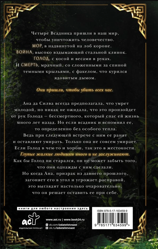 Four Horsemen have come into our world to destroy humanity. More, wearing a crown over his forehead. War, high-lifting steel blade. Hunger, with a scythe and a scale in his hands. And death is grim, with dark wings folded behind his back, with a torch that smoked poisonous smoke. They came to kill us all. Ana da Silva always assumed that she would die young, but did not expect it to happen at the hands of Hunger, the immortal who saved her life many years ago. But if the rider remembered her, it was definitely without much warmth. After all, the next time she meets him, she is wounded and left to die. Except she's not really dying. If hunger is good at anything, it is cruelty. Stupid, pathetic people deserve nothing else. No matter how hard Hunger tries, it cannot forget what they once did to it. But when Ana, a ghost from the ancient past, corners him and threatens him with violence, it looks so charming that he decides to keep her to himself.