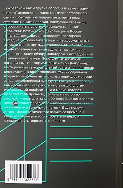 Sound recordings, as well as other ways of documenting "live" performance, are often contrasted with the events themselves as artifacts devoid of authenticity. Valery Zolotukhin's book seeks to refute this logic; exploring the traditions and practices of poetic recitation in early twentieth-century Russia, the author offers an innovative perspective on the history of literature and performative arts through the prism of media theory. Drawing on years of study of auditory archives and focusing on a survey of groundbreaking studies of sound literature, Zolotukhin analyzes borderline performative genres (for example: agitational amateur theater and collective recitation), as well as the evolution of listening techniques during one of the most intense periods of Western European cultural history. As a result, we have before us an original work at the intersection of philology, performance studies, and media studies that proposes not to read but to listen to the history of Russian literature of the early twentieth century. Another task the author sets for himself is to shed light on the mechanisms of cultural memory. After all, the interference and crackle of the phonograph roll have, over time, become a condition for us to believe in the authenticity of voices from the past.