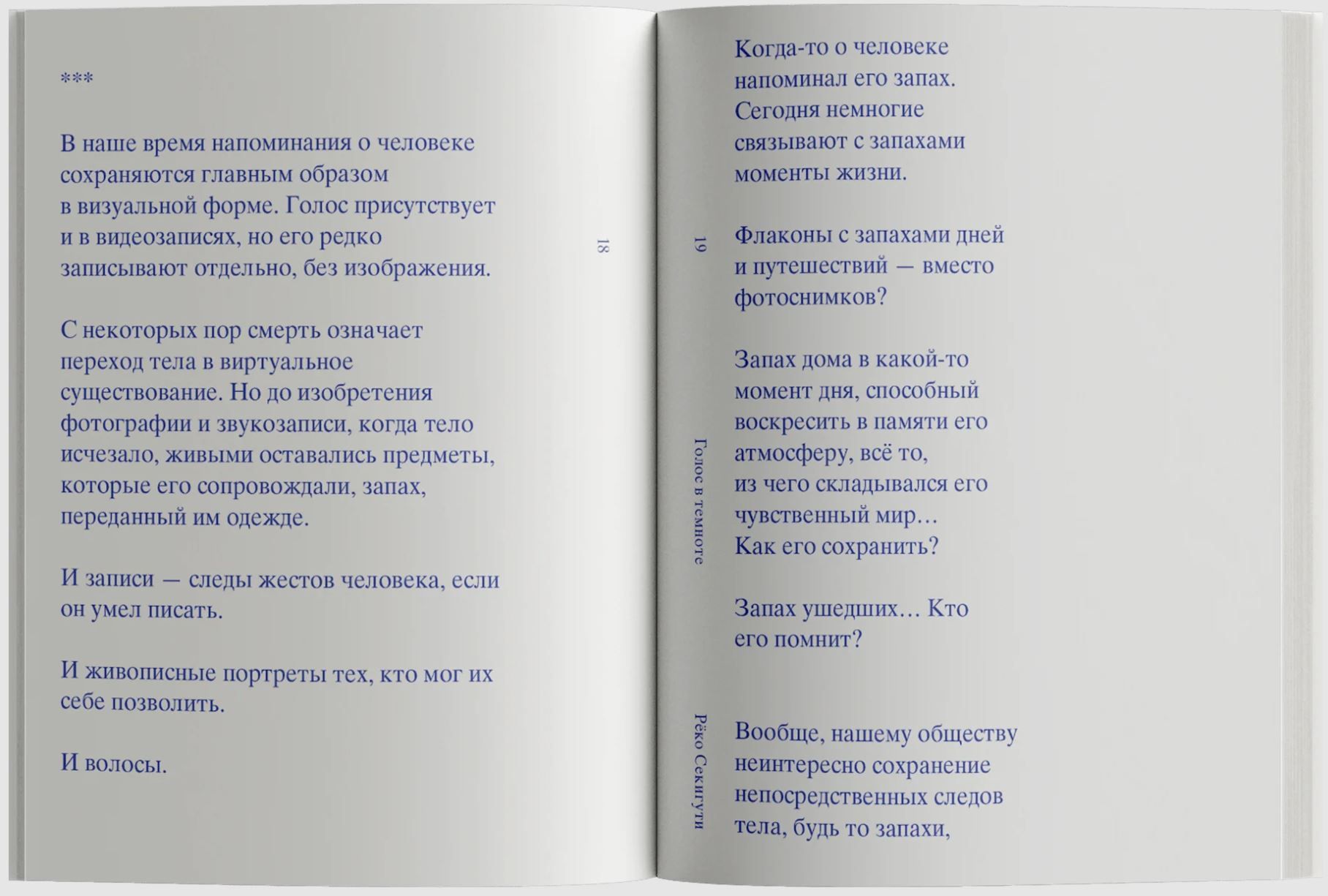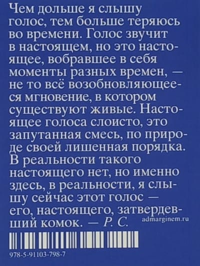 Ryoko Sekiguchi, a Japanese poet and French essayist, author of the books Nagori and 961 Hours in Beirut, translated into Russian, always, no matter what becomes the theme of her works - Japanese ideas about the change of seasons, the life of a multifaceted and polyphonic Levantine city, the tragedy in Fukushima, etc. - writes about how time is structured and how we "negotiate" with it, remembering, forgetting, savoring moments and not noticing the passing years. In this short text, combining features of diary notes, a prose poem and a philosophical essay, the human voice becomes the manifestor of time, paradoxically always existing in the present.