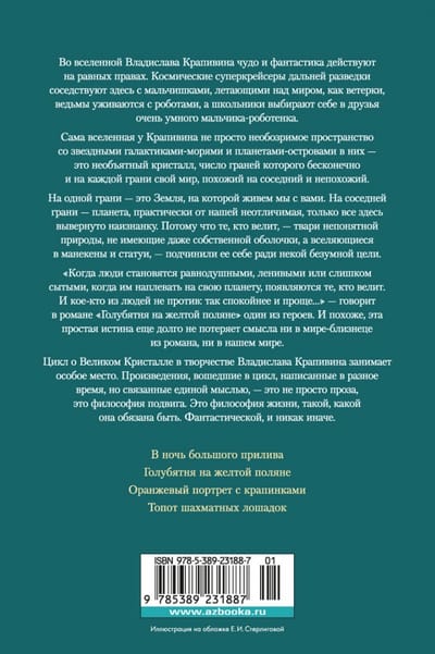 In Vladislav Krapivin's universe, wonder and fantasy operate on equal rights. Space super cruisers of long-range reconnaissance neighbor here with boys flying over the world like winds, witches get along with robots, and schoolchildren choose a very clever robot boy as a friend. Krapivin's universe itself is not just an immense space with starry galaxies-seas and planets-islands in them - it is an immense crystal, the number of faces of which is infinite and on each face there is a different world, similar to the neighboring and different. On one facet is the Earth, where we live. On the neighboring facet is a planet that is practically indistinguishable from ours, only everything here is turned inside out. Because those who command it - creatures of an incomprehensible nature, not even having their own shell, but who inhabit mannequins and statues - have subjugated it to themselves for some insane purpose. "When people become indifferent, lazy or too fed up, when they don't care about their planet, there are those who command. And some people don't mind: it's calmer and easier that way..." - says one of the characters in the novel "The Dovecote in the Yellow Glade". And it seems that this simple truth will not lose its meaning for a long time neither in the twin world of the novel, nor in our world. The cycle of the Great Crystal in the works of Vladislav Krapivin occupies a special place. Works included in the cycle, written at different times, but connected by a single thought - it is not just prose, it is a philosophy of the feat. This is a philosophy of life, such as it must be. Fantastic, and in no other way.