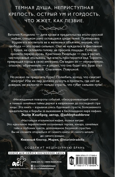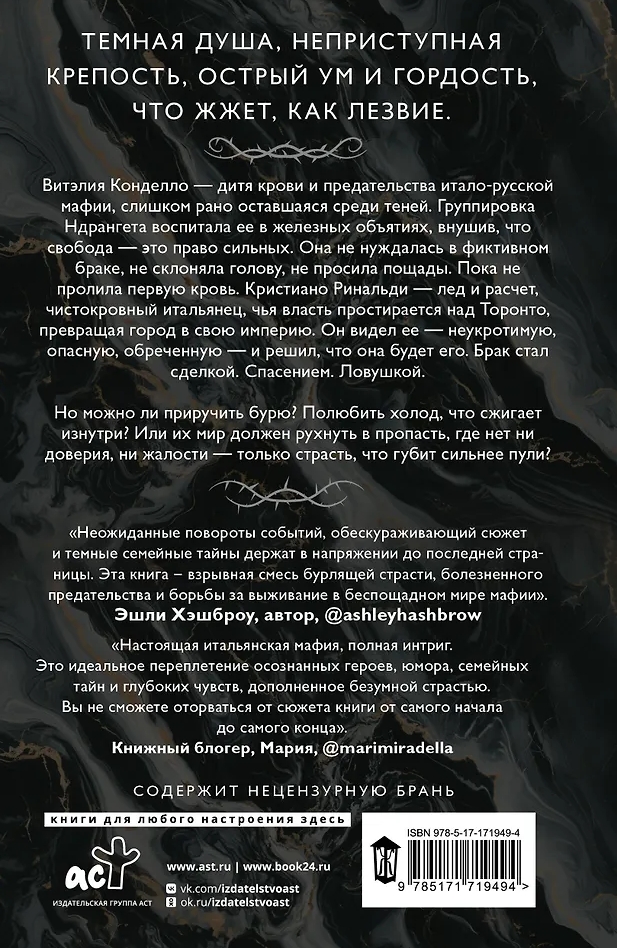 Vitalia Condello, a child of the blood and betrayal of the Italian-Russian mafia, abandoned to the shadows too early. The 'Ndrangheta raised her in an iron grip, instilling in her the notion that freedom is the right of the strong. She had no need for a sham marriage, no bowing of the head, no begging for mercy. Until she drew first blood. Cristiano Rinaldi—ice and calculation, a purebred Italian whose power extends over Toronto, turning the city into his empire. He saw her—indomitable, dangerous, doomed—and decided she would be his. Marriage became a deal. Salvation. A trap.