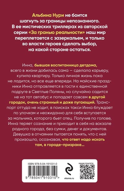 Inna, a former orphan, has achieved everything in life on her own - she made a career, bought an apartment. Only her personal life is not going well yet, but everything is still ahead. On May holidays, Inna goes to visit her only friend in Svetlye Polyany, but accidentally gets on the wrong bus and ends up in a completely different town, very strange and even frightening. There is no transport from there, Inna wanders the streets in search of a taxi and unexpectedly stands up for a boy who is being beaten by his father. After getting hit on the head, Inna loses consciousness and comes to at the train station of her hometown, without a bag, money and documents. The girl desperately tries to understand what happened to her, realizing that the answer must be sought there, in the ghost town ...