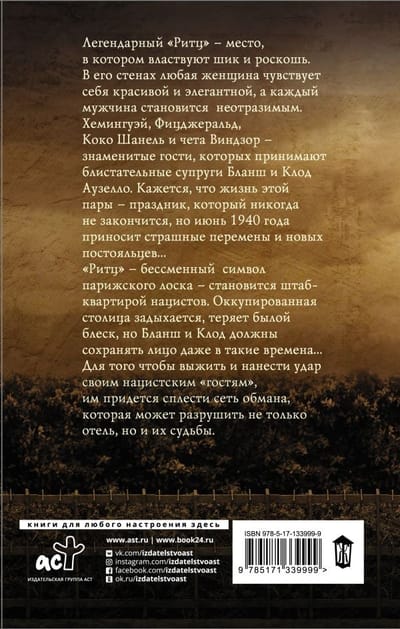 Hemingway, Fitzgerald, Coco Chanel and the Windsor couple are famous guests hosted by the brilliant couple Blanche and Claude Ausello. It seems that the life of this couple - a holiday, which will never end, but June 1940 brings terrible changes and new guests ... "Ritz" - a permanent symbol of Parisian gloss, becomes the headquarters of the Nazis. The occupied capital is suffocating, losing its former luster, but Blanche and Claude must save face even in times like these ... In order to survive and strike a blow to their Nazi "guests", they will have to weave a web of deceit that could destroy not only the hotel, but also their fates.