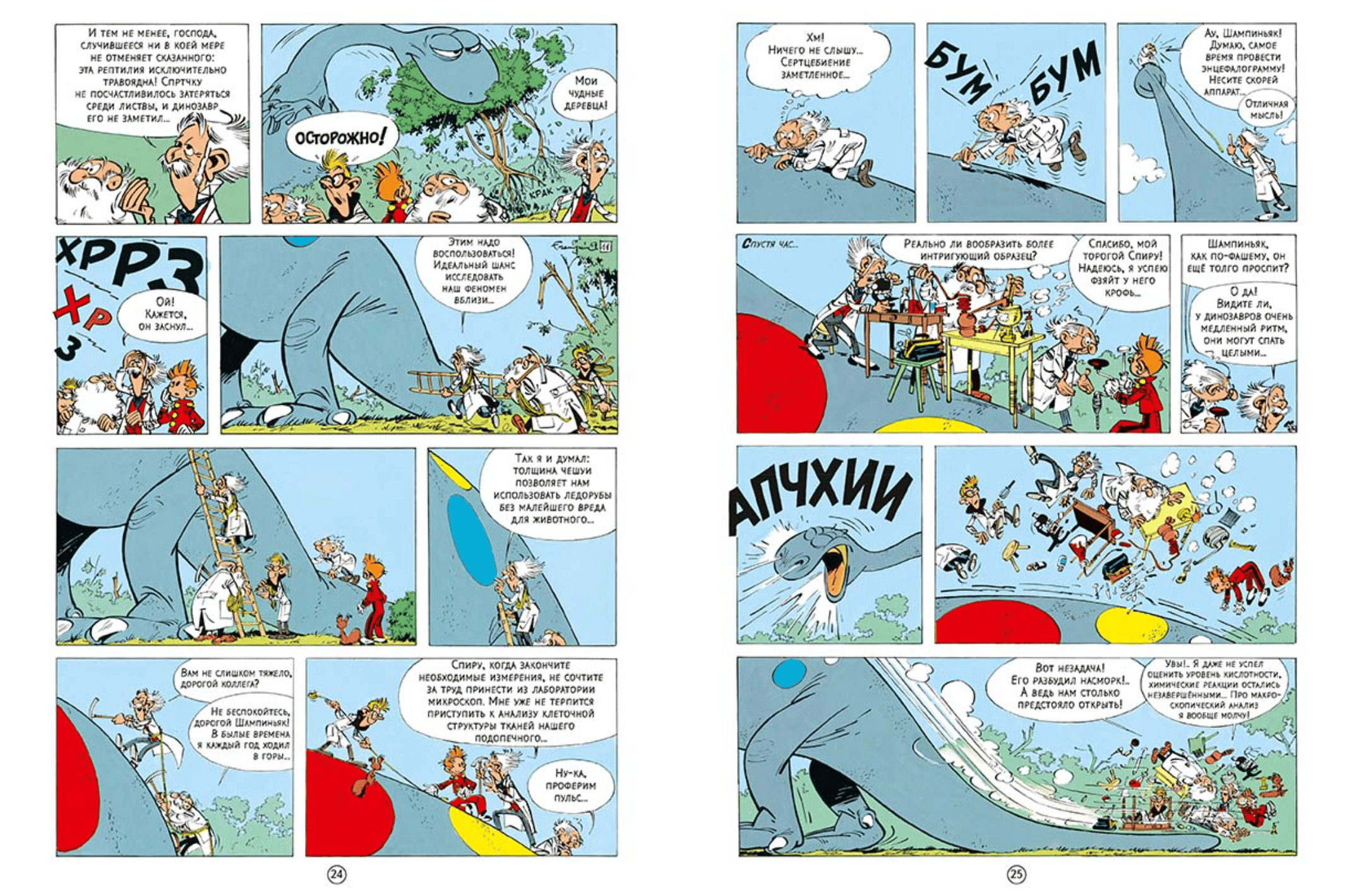 In the first story, Count de Champignac, a tireless explorer and brilliant scientist, discovers a dinosaur egg from the late Jurassic period of the Mesozoic Era in the ice of Antarctica. With every precaution, the Count brings the priceless find home. In his laboratory, he plans to remove the egg from deep freezing, slowly warm it back to life, and then place it in an incubator where it will hatch into a living Plateosaurus. Indeed, the Count and his fellow scientists, who have come from various countries, witness an incredible event—the birth of a dinosaur. However, by a fateful coincidence, the baby grows to colossal proportions overnight. The prehistoric giant leaves the Count's estate and heads for the city, wreaking havoc on everything in its path. The city authorities are in a panic, the military scrambles planes and calls in tanks. Amid all this chaos, Spirou hatches a brilliant plan to isolate the dinosaur, yet preserve it for science and make it useful to society.