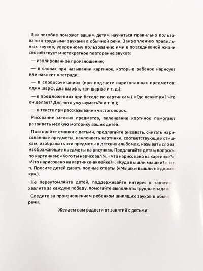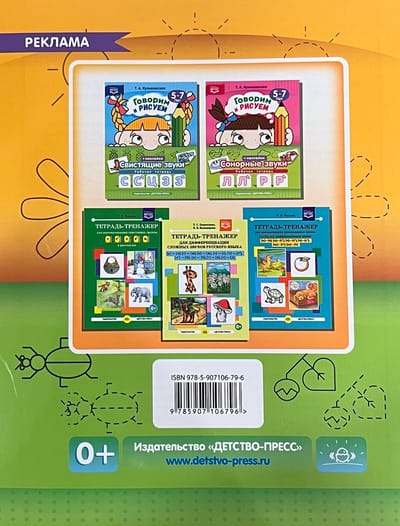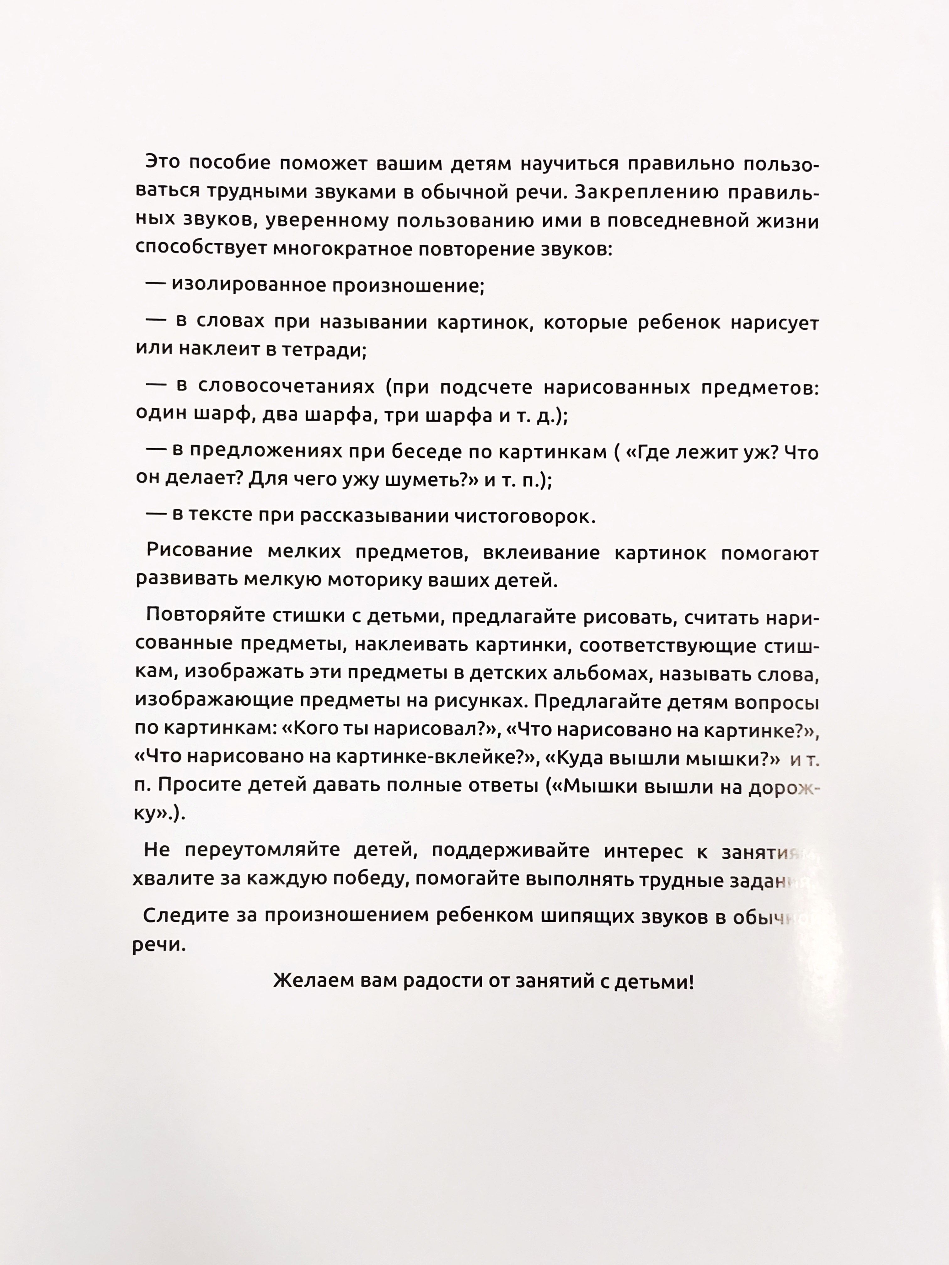 The manual is designed to teach children aged 5-7 to pronounce sounds correctly and use them not only in isolation, but also in words, word combinations and sentences. The book contains author's verses-clear sayings on the sounds studied, images for drawing and coloring, as well as colored pictures for pasting. The publication will be interesting and useful for educators, speech therapists of ECE centers, as well as parents and governesses in home lessons with children.