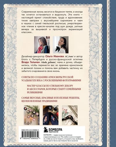 Modern life rushes at a frantic pace, every day brings new stress, there are millions of new products that will not live a year. And like never before, I want to stop, breathe out, and turn to something eternal, unshakable. Look for inspiration not in the shaky future, but in the familiar past. This book is a real haven of tranquility, work and inspiration: quiet breakfasts with delicious cheesecakes and tea in cups with blue Gzhel painting, peaceful reading in a rocking chair under the sound of rain, cozy evenings with embroidery and watching film adaptations of classics ...