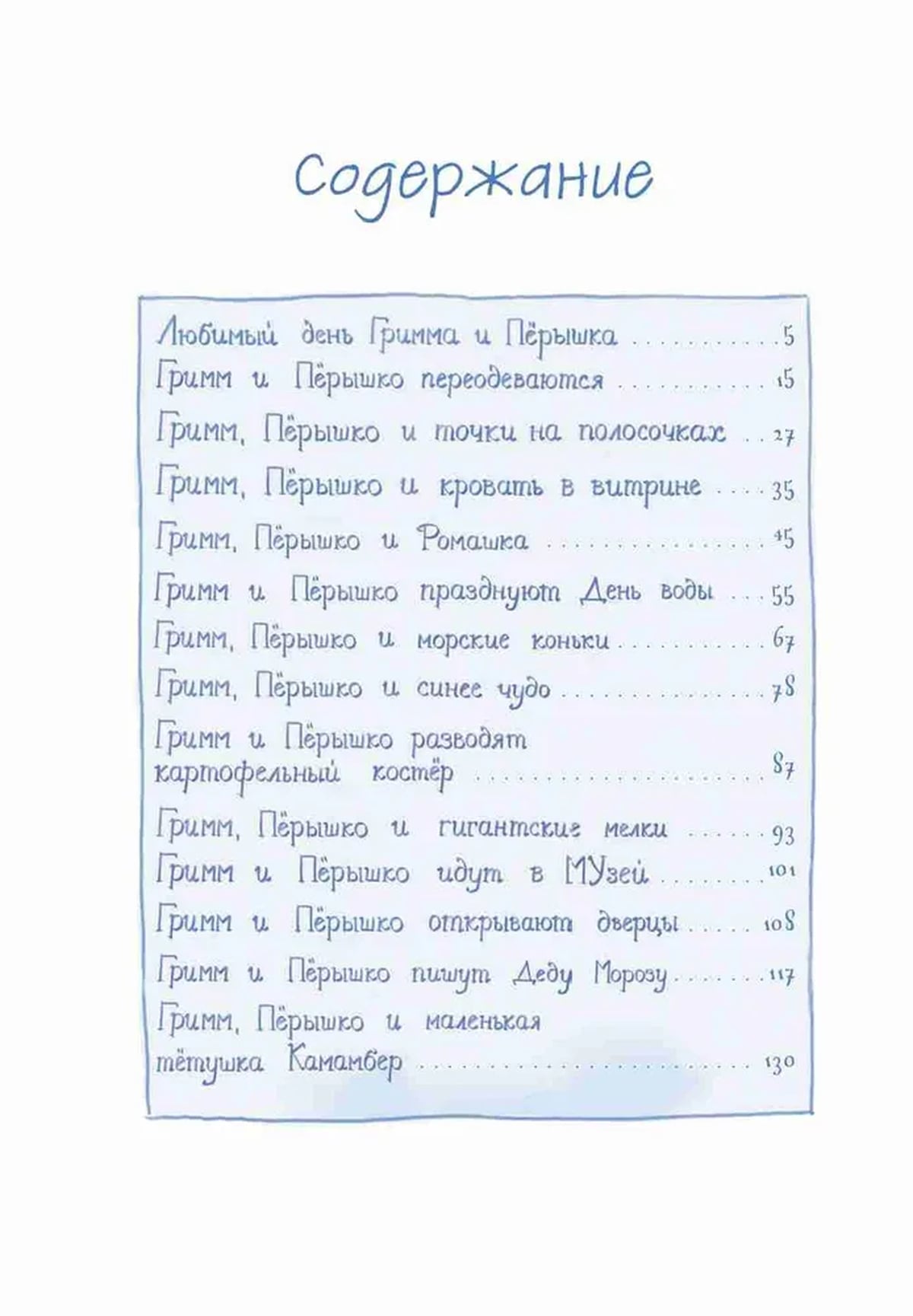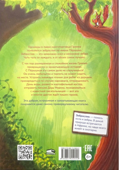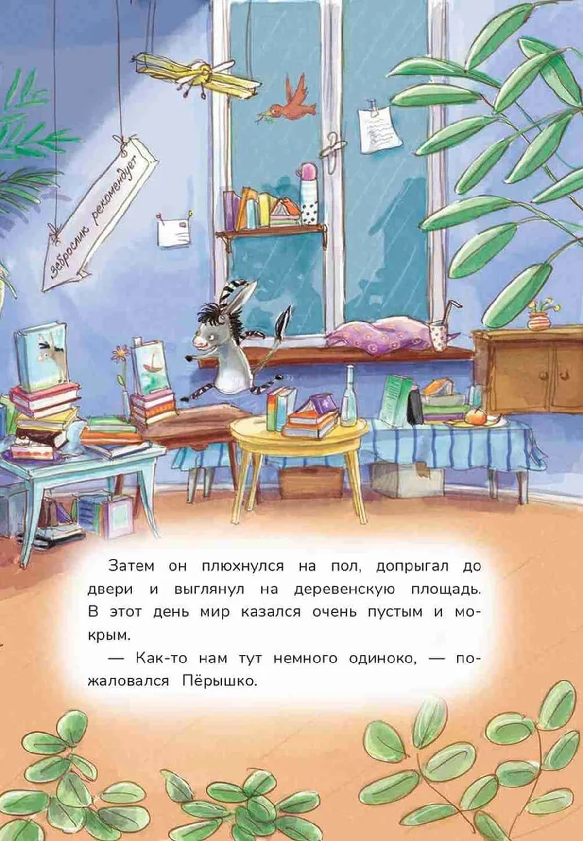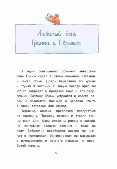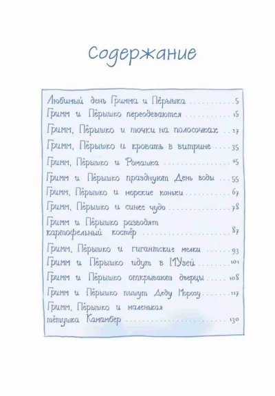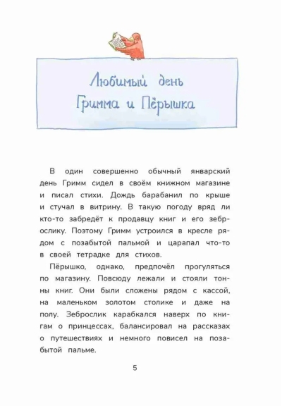 From then on, Grimm's quiet, measured life turns into a captivating adventure. You really won't get bored with Feather! He's very curious and hates to sit still. Organizing a book reading for the village children, dressing up for Carnival, celebrating Water Day, lighting a potato bonfire, sending a letter to Santa Claus, meeting a famous writer—all this and much more awaits our heroes.