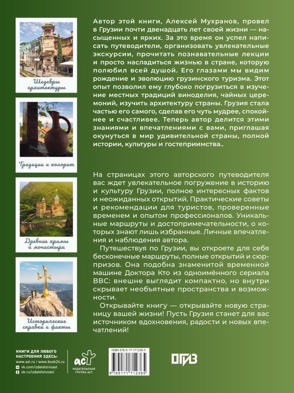 The author of this book, Alexey Mukhranov, spent nearly twelve years of his life in Georgia—full of exciting experiences. During this time, he wrote guidebooks, organized fascinating excursions, gave informative lectures, and simply enjoyed life in a country he loved with all his heart. Through his eyes, we see the birth and evolution of Georgian tourism. This experience allowed him to deeply immerse himself in the local traditions of winemaking and tea ceremonies, and explore the country's architecture. Georgia became a part of him, making him a little wiser, calmer, and happier. Now he shares this knowledge and impressions with you, inviting you to immerse yourself in the world of this amazing country, full of history, culture, and hospitality.