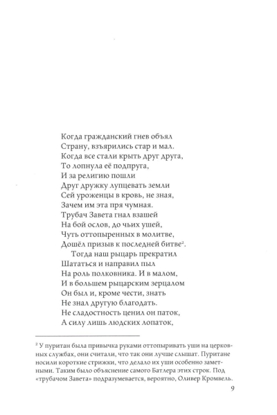 Samuel Butler was one of the most incisive and brilliant English satirists of the 17th century. His poem "Hudibras" (1663-1678) was a literary landmark in its time and remains a model of political and philosophical irony. In the turbulent years following the English Civil War, the Puritan knight Hudibras and his squire Ralpho wander the country, getting into absurd scrapes, arguing about faith, power, and virtue, and unwittingly exposing the hypocrisy, fanaticism, and vanity of ideologies. A kind of burlesque Don Quixote, "Hudibras" combines a subtle parody of the chivalric epic, a satire on religious wars, the grotesque, and a learned play on form. Brilliant rhymes, puns, theatrical debates, and unexpected imagery transform Butler's work into a literary fireworks display, where profound doubt lurks behind the joke, and a tragic era lies behind the comical focus. This is the first time it has been published in Russian.