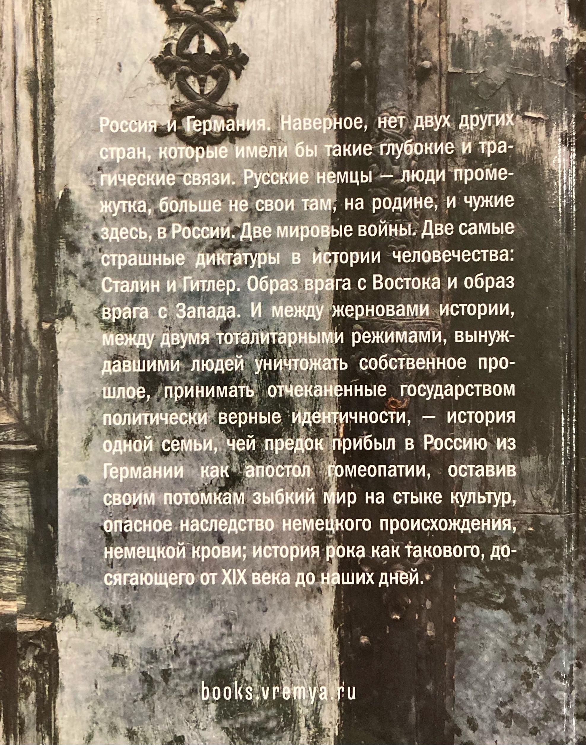Russia and Germany. There are probably no other two countries that have such deep and tragic ties. Russian Germans are people of the in-between, no longer their own there in their homeland and strangers here in Russia. Two world wars. The two worst dictatorships in human history: Stalin and Hitler. The image of the enemy from the East and the image of the enemy from the West. And between the millstones of history, between the two totalitarian regimes that forced people to destroy their own pasts, to adopt politically correct identities minted by the state, is the story of one family whose ancestor came to Russia from Germany as an apostle of homeopathy, leaving his descendants a shaky world at the crossroads of cultures, a dangerous legacy of German ancestry, German blood; the story of rock as such, reaching from the nineteenth century to the present day.