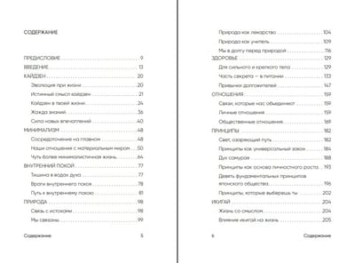 Proper health care, connection with nature, minimalism, fulfilling relationships with others, and a system of values are the key pillars of conscious living that form the basis of the author's methodology.