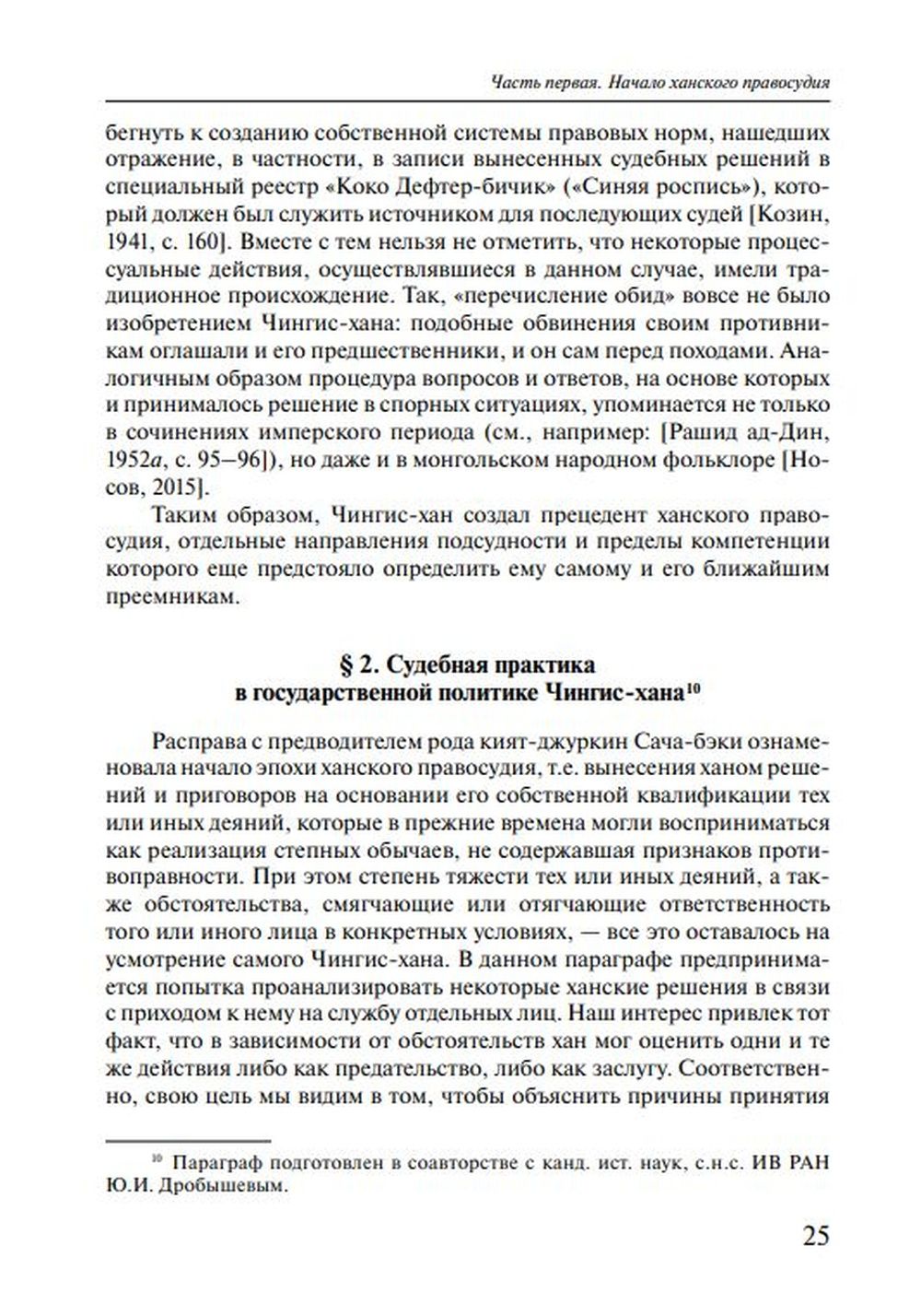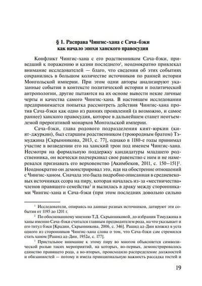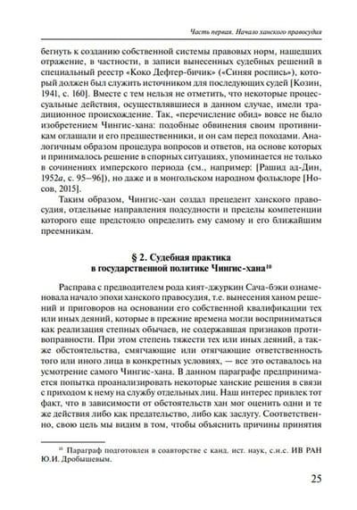 The monograph is the first in historical and legal science to attempt to characterize the court and process in the Turkic-Mongol states based on the Mongolian imperial law, which was created by Genghis Khan at the turn of the 12th–13th centuries and was used by his successors until the beginning of the 20th century.