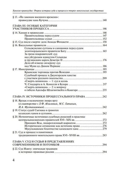 The systematization of information from numerous legal and non-legal monuments made it possible not only to reconstruct elements of the court and process in a number of countries and regions at certain historical stages, but also to show how contemporaries and descendants treated the khan's justice.