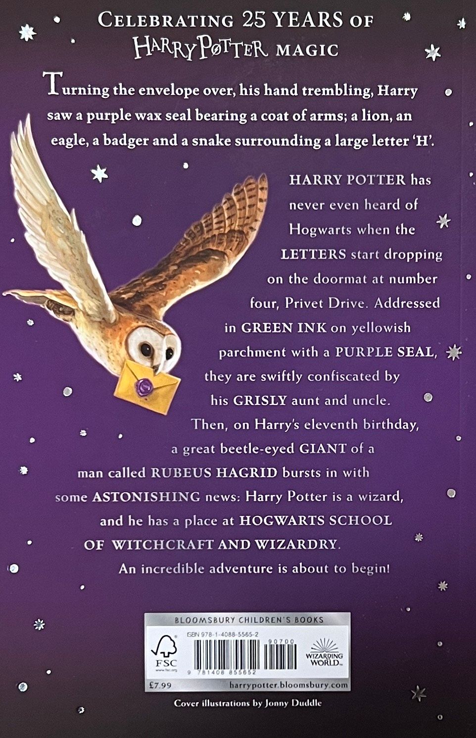 Harry Potter has never even heard of Hogwarts when the LETTERS start dropping on the doormat at number four, Privet Drive. Addressed in GREEN INK on yellowish parchment with a PURPLE SEAL, they are swiftly confiscated by his GRISLY aunt and uncle. Then, on Harry's eleventh birthday, a great beetle-eyed giant of a man called RUBEUS HAGRID bursts in with some ASTONISHING news: Harry Potter is a wizard, and he has a place at Hogwarts School of Witchcraft and Wizardry. An incredible adventure is about to begin!