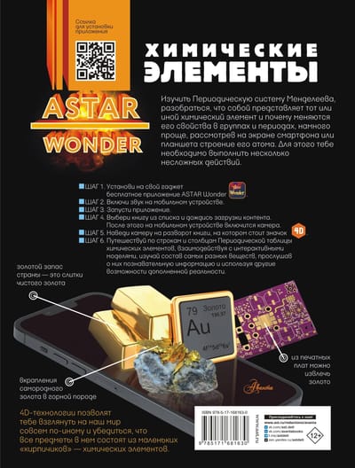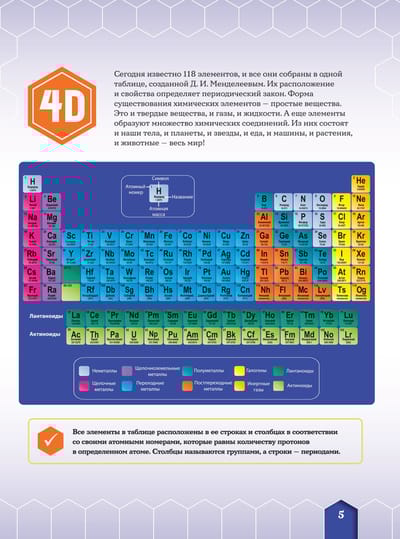 This book describes all the chemical elements that the great Russian scientist D. I. Mendeleyev brought into a certain system. The unusual stories of their discovery, distribution, properties and, of course, practical application are presented here in the form of interesting, capacious articles accompanied by numerous illustrations and explanatory diagrams. And 4D technologies will make your journey through the columns and rows of the most famous table in the world - the Periodic Table of Chemical Elements - more understandable and exciting. Interacting with interactive models, you will see how the atom of some substances is structured, what this or that element is and how it is used by humans, you will hear interesting facts about it. And what is important, studying this book, you will be able to see that all the objects around us consist of chemical elements, which means that they are a kind of building blocks of the universe.