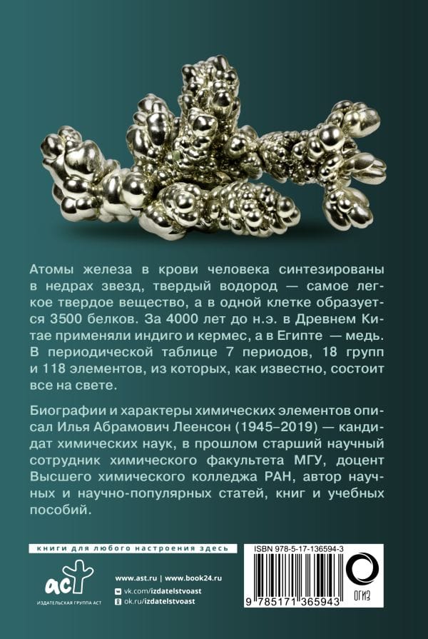 Iron atoms in human blood are synthesized in the depths of stars, solid hydrogen is the lightest solid, and 3,500 proteins are formed in a single cell. 4000 years before Christ, indigo and kermes were used in ancient China, and copper was used in Egypt. The Periodic Table has 7 periods, 18 groups and 118 elements, of which everything in the world is known to be made up. Biographies and characters of chemical elements are described by Ilya Abramovich Leenson -- candidate of chemical sciences, senior researcher of the chemical faculty of Moscow State University, associate professor of the Higher Chemical College of the Russian Academy of Sciences, author of scientific and popular science articles, books and textbooks.