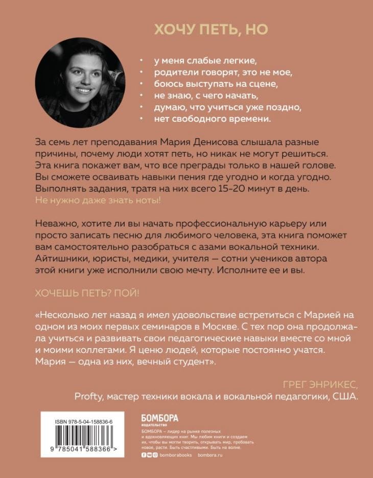 Maria Denisova is a pop vocal teacher, singer, poet and composer. She wrote this book to inspire the reader to make their dream of starting to sing come true. You will be able to prove to yourself that singing your first song is not as difficult as it seems at first glance, and there is no reason to deny yourself the fulfillment of this desire.