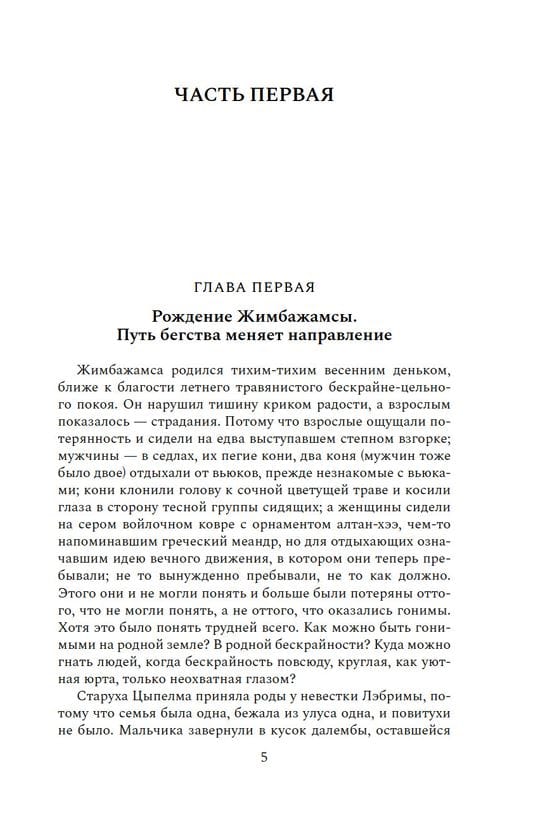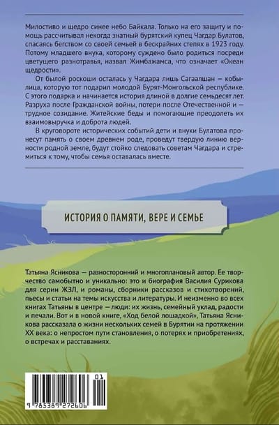The blue sky of Lake Baikal is merciful and generous. The noble Buryat merchant Chagdar Bulatov counted only on its protection and help when he fled with his family to the endless steppes in 1923. That is why he named his youngest grandson, who was destined to be born amidst blooming grasses, Zhimbazhamsa, which means "Ocean of Generosity".