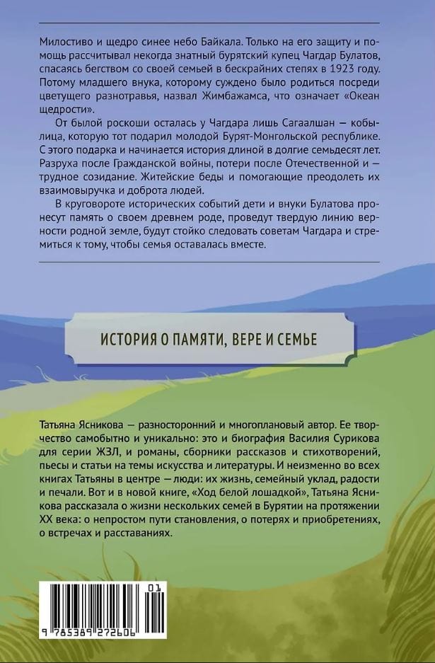 From the former luxury, Chagdar only had Sagaalshan, a mare that he gave to the young Buryat-Mongolian Republic. With this gift begins a story that lasted seventy years. Devastation after the Civil War, losses after the Patriotic War and - difficult creation. Everyday troubles and - mutual assistance, kindness of people helping to overcome them. In the whirlwind of historical events, Bulatov’s children and grandchildren will carry the memory of their ancient family, will draw a firm line of loyalty to their native land, will steadfastly follow Chagdar’s advice and strive to ensure that the family remains together.