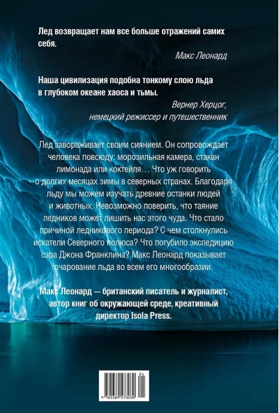 "Ice has been one of the most important bridges connecting us to the natural world... It has influenced human development since ancient times, accompanying farmers and nomads of prehistory... Without ice, we would not be able to feed ourselves or treat the sick as we do today." "Science would not have developed in the directions it has. Without ice, our cities, villages, seas, and oceans would look completely different, and many of the masterpieces that adorn galleries and libraries would simply not exist" (Max Leonard).