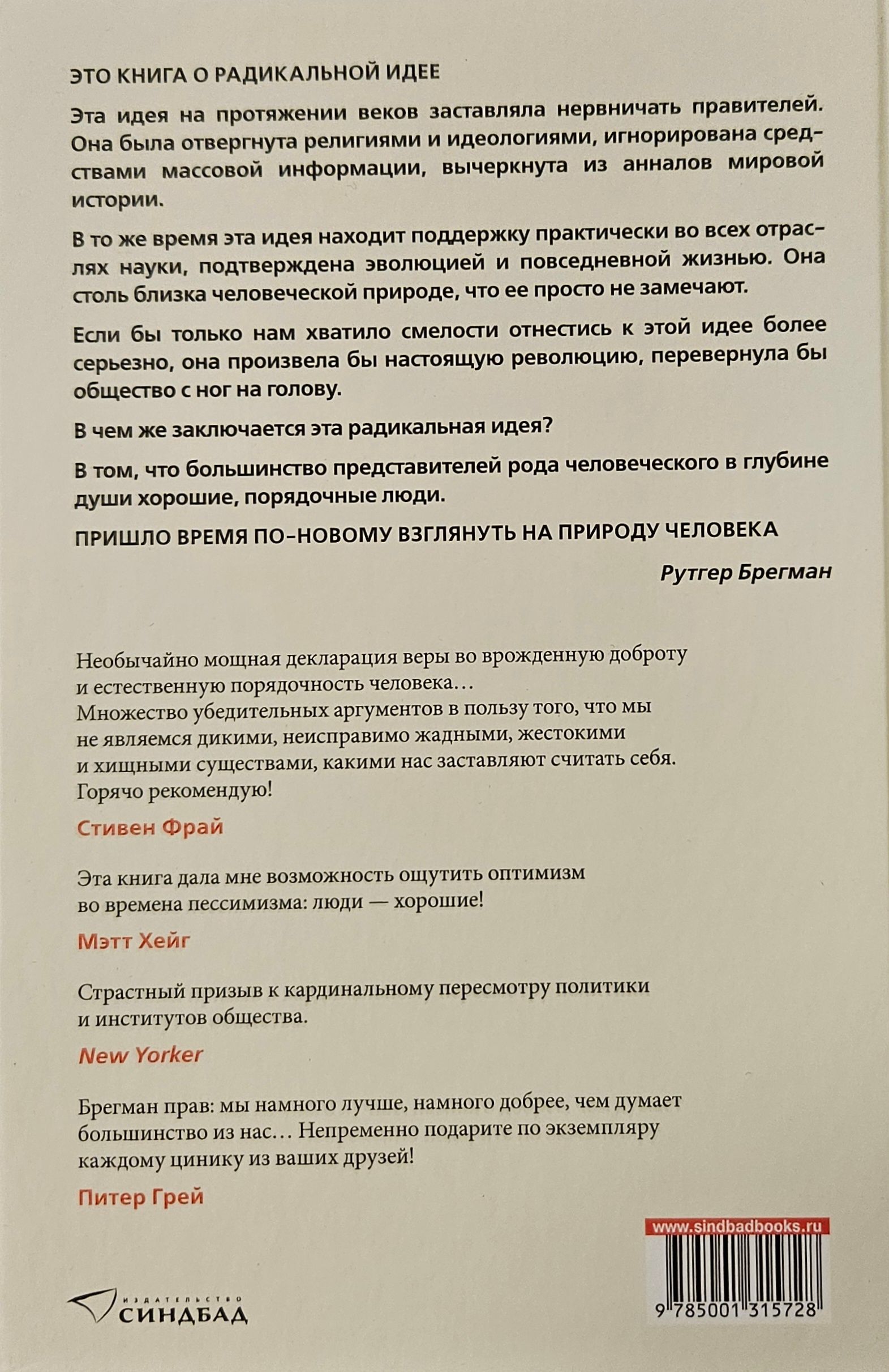 Ancient thinkers and modern authors, psychologists and philosophers, politicians of right and left views agree that man is inherently bad. We are told that we humans are selfish and are driven primarily by personal interests. But what if it isn't? Rutger Bregman offers a new perspective on human history. It shows that we are programmed to be kind, cooperative, and more likely to trust others than to be suspicious of each other. And this instinct has a solid evolutionary foundation laid down in the early stages of Homo sapiens evolution. Bregman gives a real story that refutes the idea of “Lord of the Flies”, tells about the fabrication of high-profile psychological experiments, about two twin brothers who, despite the difference in views, helped prevent civil war.