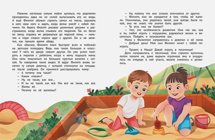 Children are conservative by nature, that is why it is so important that adults pay attention to the diversity of the world around us and to the fact that this diversity does not divide us, but enriches us. We may look different, have different incomes, different families, different strengths and weaknesses, but we have a lot in common. The ability to notice common ground is an important communication skill that not only makes life more joyful, but is extremely useful. Children's psychologist and art therapist Elena Burievaia has come up with stories about a boy, Philip, who together with his parents learns a lot of new things about the world: he meets children who look and behave differently, who may have different financial opportunities or who live in a single-parent family. Philip is convinced that differences are not a hindrance to communication and play. Read stories together with your toddler and discuss them. At the end of the book there are recommendations for parents.