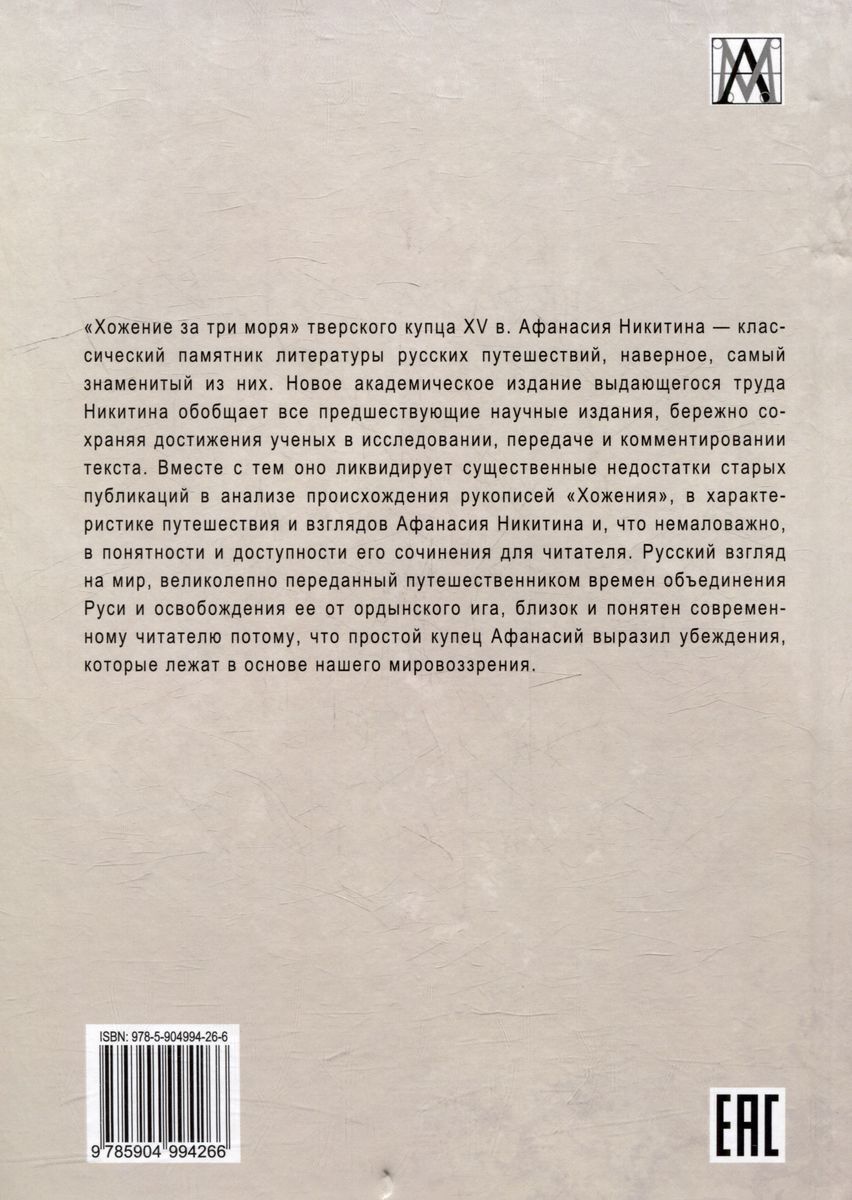 "The Three Seas Voyage" by the 15th century Tver merchant Afanasy Nikitin is a classic monument of Russian travel literature, probably the most famous of them all. The new academic edition of Nikitin's outstanding work summarizes all previous scholarly editions, carefully preserving the achievements of scholars in researching, transmitting and commenting on the text. At the same time, it
