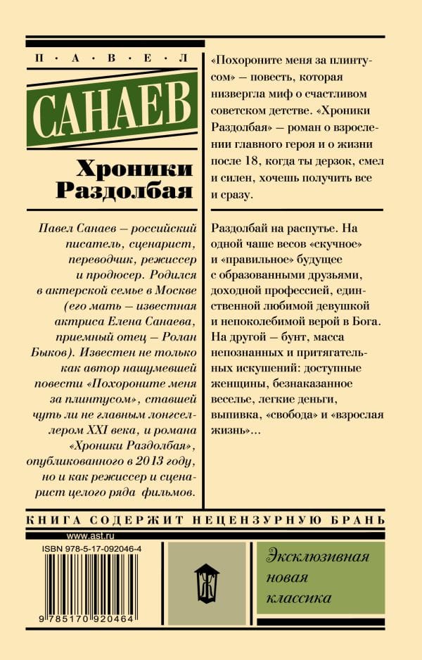 "Chronicles of Razdolbai" - the continuation of the cult novel by Pavel Sanayev "Bury me behind the baseboard". The hero is nineteen years old, and everyone calls him Razdolbai. Torn by contradictory desires and aspirations, then subject to the influence of others, then defending their beliefs, Razdolbai will learn life by trial and error. Prostitutes and sex, freedom, impunity and rebellion - on the one hand; a single favorite girl, educated friends and faith in God - on the other. Perhaps the most appealing thing about Pavel Sanayev's new novel is the extreme sincerity of the protagonist. He will share with us those thoughts and feelings that we are afraid to admit to ourselves.