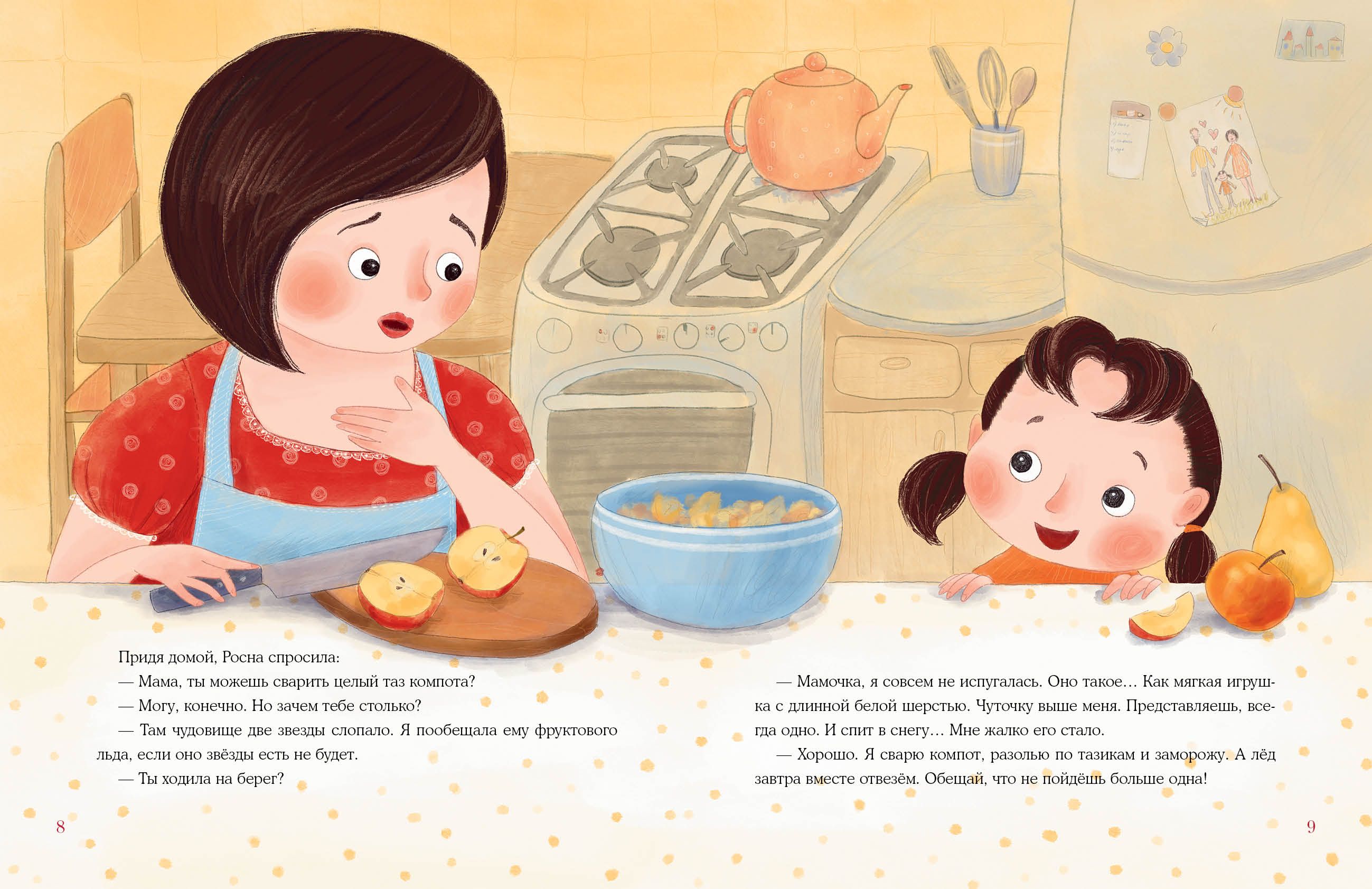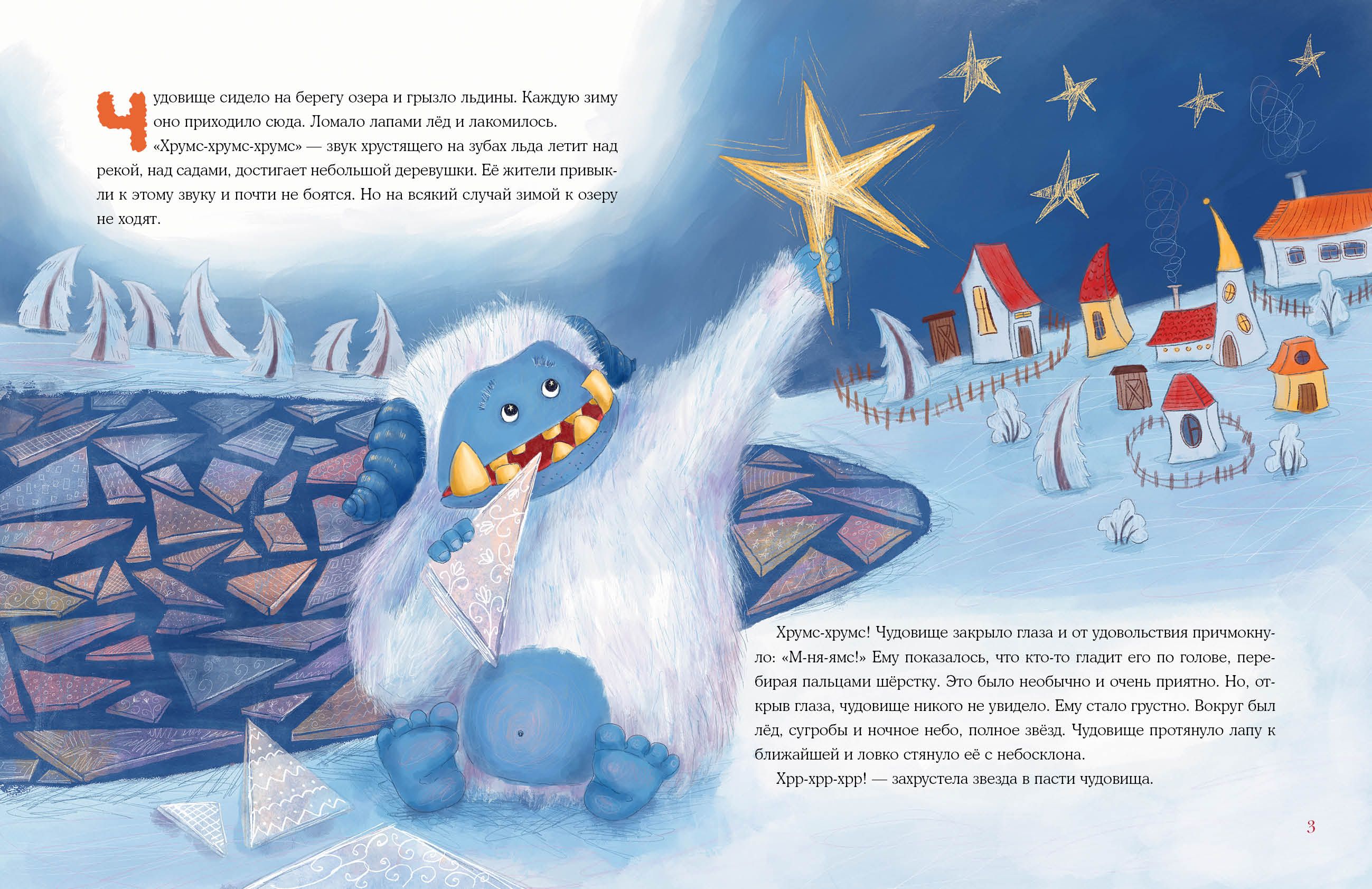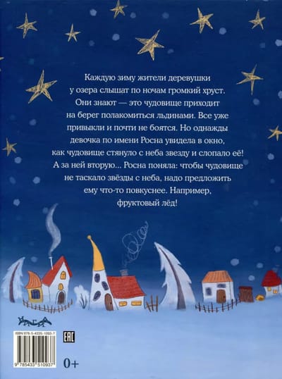 Every winter, the inhabitants of a small village by the lake hear a loud crunching sound at night. They know it's a monster coming to the shore to eat ice floes. Everyone has gotten used to it and is almost not afraid of it. But one day a girl named Rosna saw through the window how the monster pulled a star from the sky and ate it! And then another one. Rosna realized that to stop the monster from snatching stars from the sky, she had to offer him something tastier. Like fruit ice! Soon all the villagers, having learned about the unusual incident, began to take turns preparing a treat for the monster. And one evening, after New Year's Eve, Rosna did not hear the usual crunch....