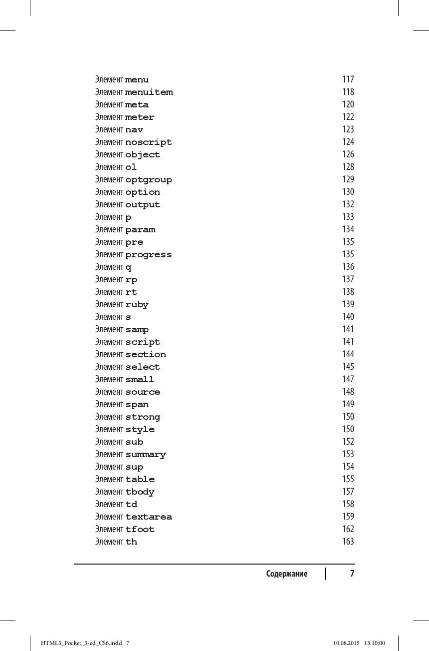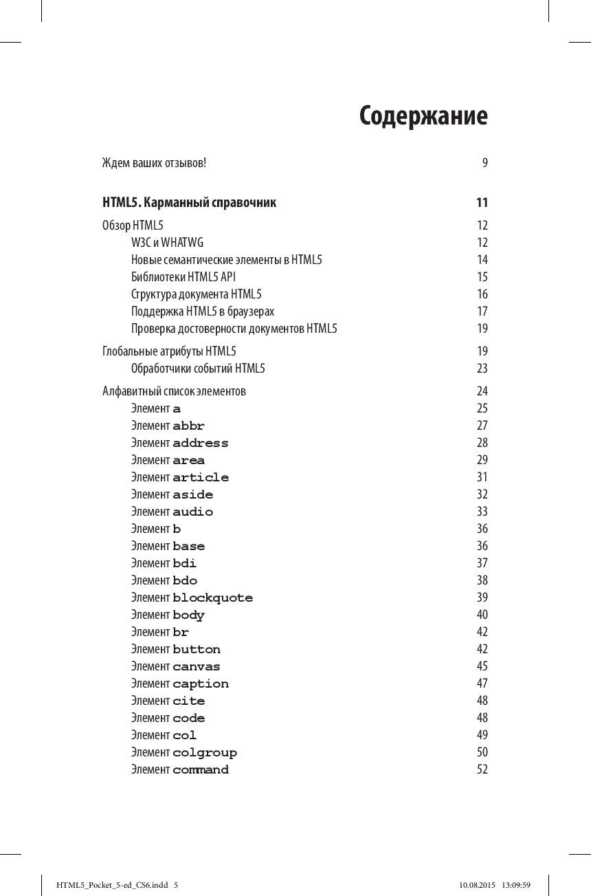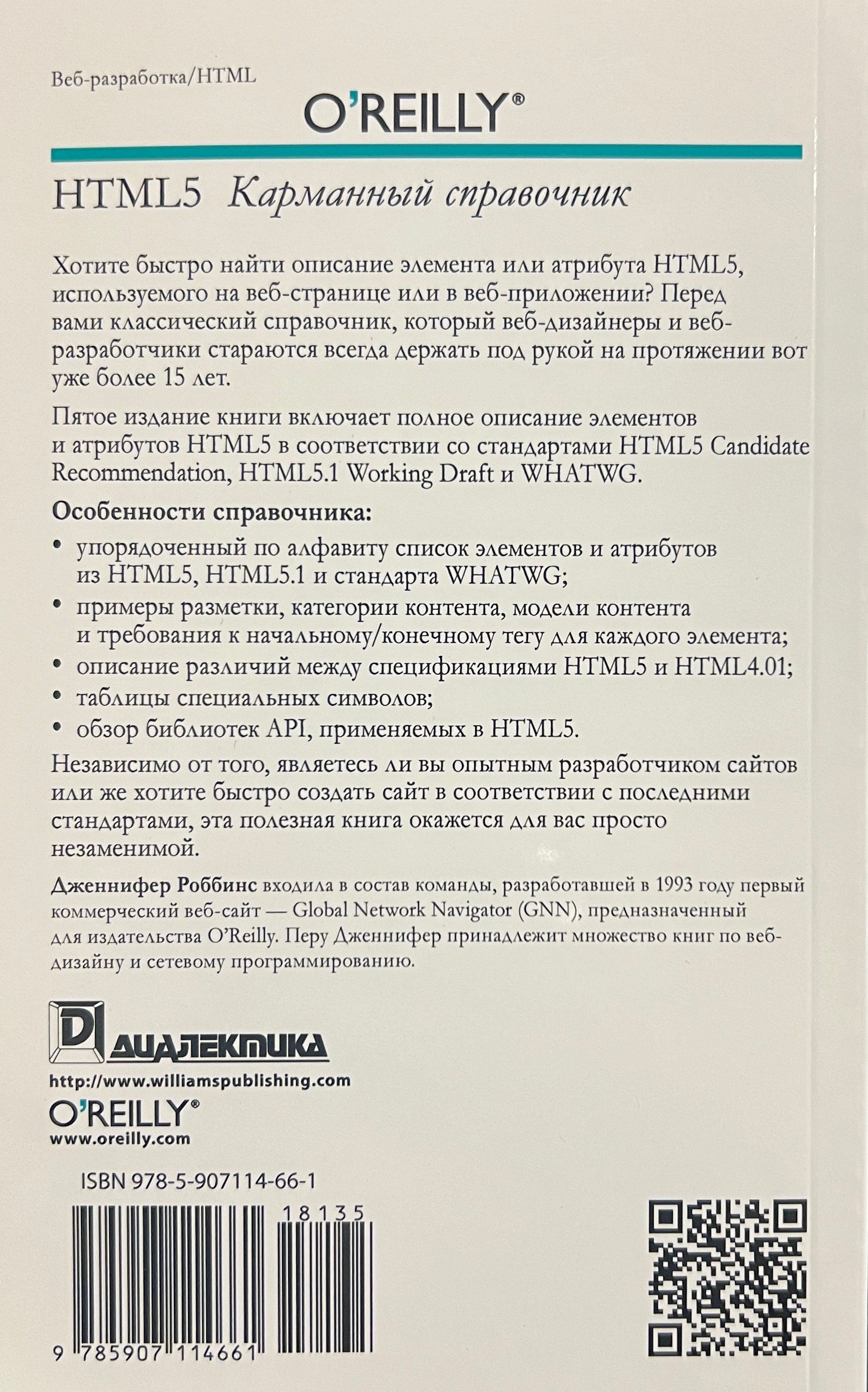 Want to quickly find a description of an HTML5 element or attribute used on a web page or in a web application? Here is a classic reference that web designers and web developers have been trying to keep at hand for more than 15 years. The fifth edition of the book includes a complete description of HTML5 elements and attributes in accordance with the HTML5 Candidate Recommendation, HTML5.1 Working Draft, and WHATWG standards. . Features of the reference: