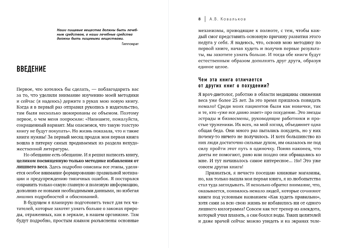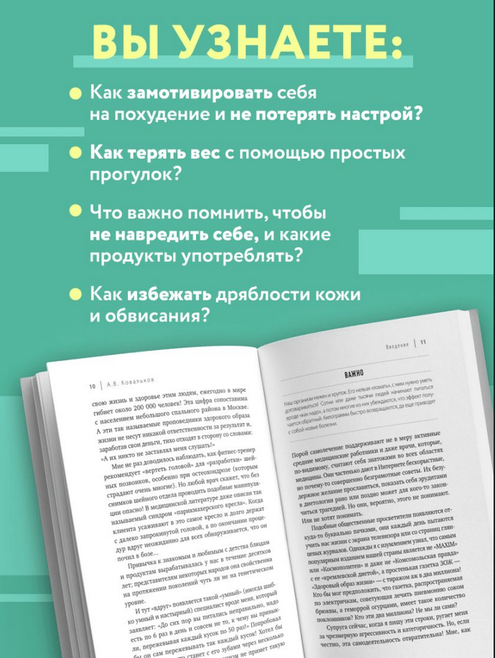Dr. Kovalkov's method is based on three simple steps, each of which is described in detail in this book. Alexey Vladimirovich not only describes in detail what and how to do to achieve success, but also shares advice that will help you overcome difficulties on the way to an ideal body, and also gives important tips and comments.