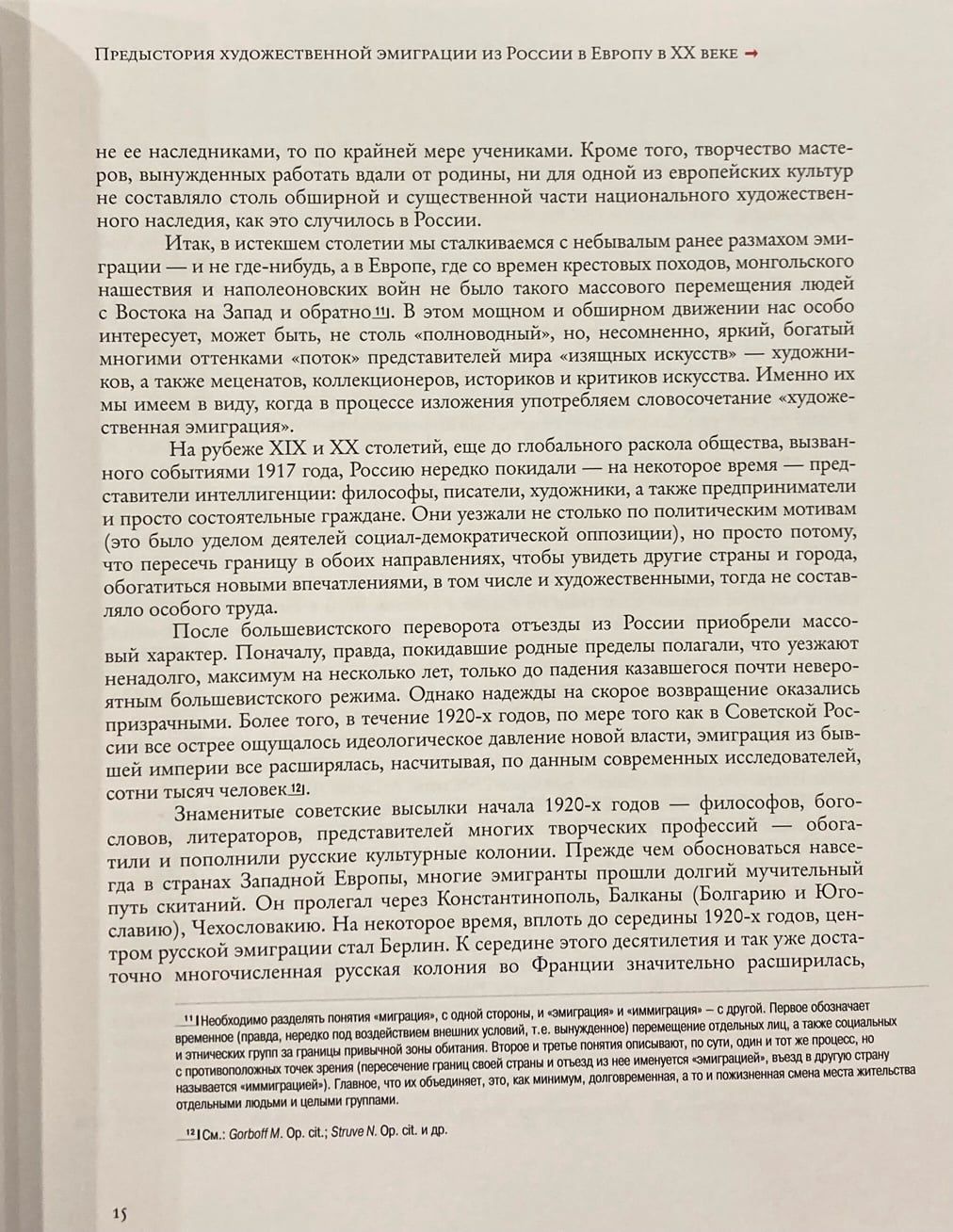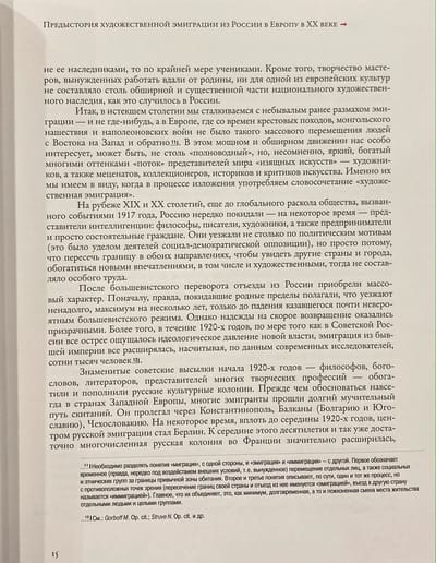 The book is a fundamental study of the phenomenon of Russian artistic emigration of the "first wave". It concerns artists who began their professional activities on the territory of the Russian Empire, but were forced to continue them in other countries: Turkey (Constantinople), the Kingdom of Serbs, Croats and Slovenes (Belgrade), Czechoslovakia (Prague), Germany (Berlin) and France (Paris). The author considers the art of Russian emigration as an independent stream of a single domestic artistic tradition, separated from the cultural processes in the homeland due to its non-creative nature - the Bolshevik Revolution of 1917. The uniqueness of the book is that both streams - both domestic and emigrant - are presented here as two parts of one cultural phenomenon - Russian art. The range of names of masters touched upon in the book is very wide: from the world-famous V. Kandinsky, M. Chagall, H. Soutine, N. Goncharova, M. Larionov to those forgotten in their homeland Marevna, S. Charchoune, I. Puni, N. Tarkhov; from the retrospective artists of the "World of Art" circle A. Benois, K. Somov, stylists B. Grigoriev, A. Yakovlev and Yu. Annenkov to the experimenters and modernists P. Tchelitchew, V. Baranov-Rossine, A. Pevzner, A. Lanskoy, S. Polyakov, N. de Stael and others. The book is richly illustrated, supplied with extensive appendices and is addressed to both specialists and a wide range of lovers of Russian art of the 20th century.