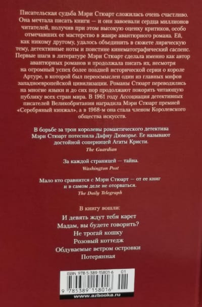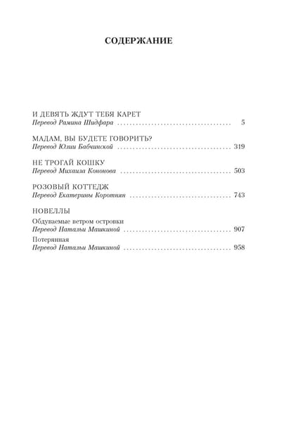 The young Englishwoman Linda, the heroine of the novel "And nine carriages await you", comes to France to become the governess of nine-year-old Philippe, Count de Valmy. In front of her eyes occur strange events that make you wonder: what kind of invisible drama unfolds under the vaults of the family castle? The novel "Madame, Will You Speak?" begins with an invitation to travel. Charity together with a friend goes on a trip to the enchanting south of France, but a chance meeting forces her to change her plans ... After the death of her father, Brioni, the heroine of the novel "Don't Touch the Cat", returns to the family estate and learns that in the last minutes of life her father tried to warn her of some danger... In the novel Pink Cottage, Kate Herrick is on an errand for her grandmother: to find a stash of family heirlooms in their former home. Kate soon discovers that she has been beaten to the task: the stash is empty.... Young heroines first translated into Russian novels "Windblown Islands" and "Lost" will have to show character in the fight against unforeseen circumstances...