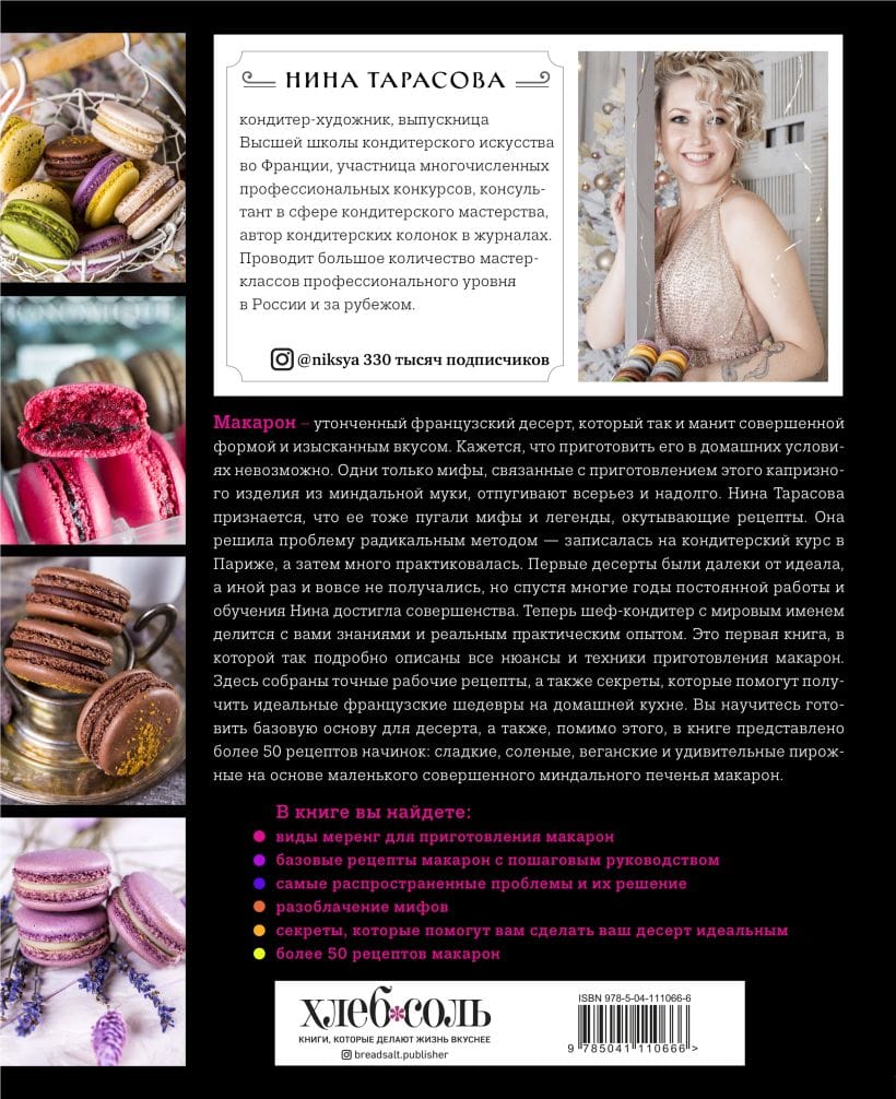 Macaron is a sophisticated French dessert that beckons with its perfect shape and exquisite flavor. It seems that it is impossible to prepare it at home. Just the myths associated with the preparation of this capricious product made of almond flour, scare away seriously and for a long time. Nina Tarasova admits that she too was frightened by the myths and legends enveloping the recipes. She solved the problem with a radical method - she enrolled in a pastry course in Paris, and then, of course, practiced a lot. The first desserts were far from ideal, and sometimes they did not turn out at all, but after many years of constant and hard work and training, Nina was able to achieve perfection. Now the world-renowned pastry chef shares her knowledge and real practical experience with you. This is the first book that describes in such detail all the nuances, techniques of cooking macarons, all, without exception, possible mistakes and how to avoid them. Here are collected accurate, working recipes, as well as secrets that will help you get the perfect French masterpieces in miniature in a simple home kitchen. You will learn how to prepare a basic dessert base, and on top of that, the book contains over 50 recipes for fillings to suit every taste: sweet, savory, vegan, and amazing cakes based on the perfect little almond macaroon cookies.