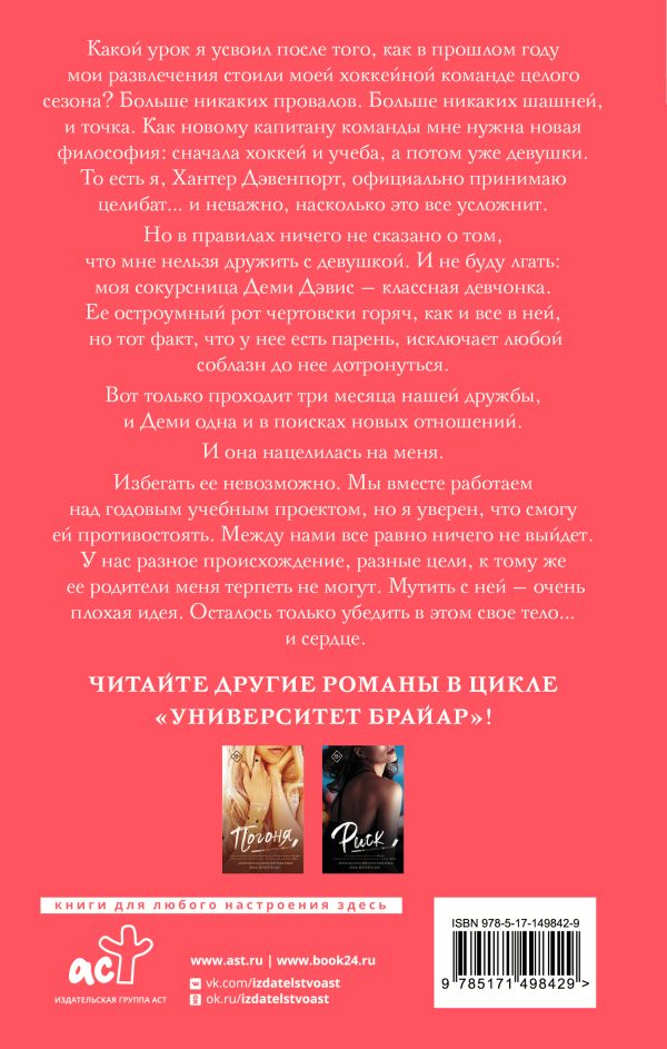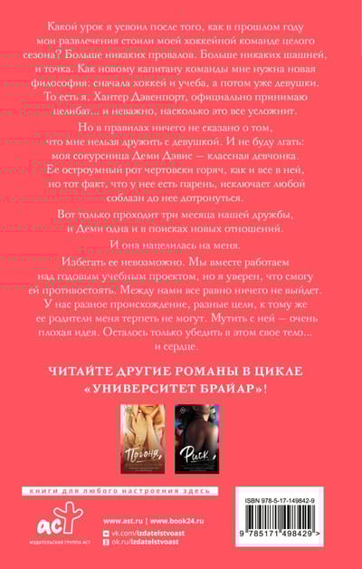 What lesson did I learn after my entertainment cost my hockey team an entire season last year? No more screw-ups. No more shenanigans, period. As the new team captain, I need a new philosophy: hockey and academics first, then girls. So I, Hunter Davenport, am officially embracing celibacy...no matter how much it complicates things. But there's nothing in the rules that says I can't be friends with a girl. And I'm not gonna lie: my fellow student Demi Davis is a great gal. Her witty mouth is as damn hot as everything about her, but the fact that she has a boyfriend eliminates any temptation to touch her. Except three months into our friendship passes, and Demi's alone and looking for a new relationship. And she's got her sights set on me. She's impossible to avoid. We're working on a year-long class project together, but I'm sure I can stand up to her. It's not gonna work out between us anyway. We have different backgrounds, different goals, and her parents can't stand me. Hooking up with her is a very bad idea. All I have to do is convince my body... and my heart.