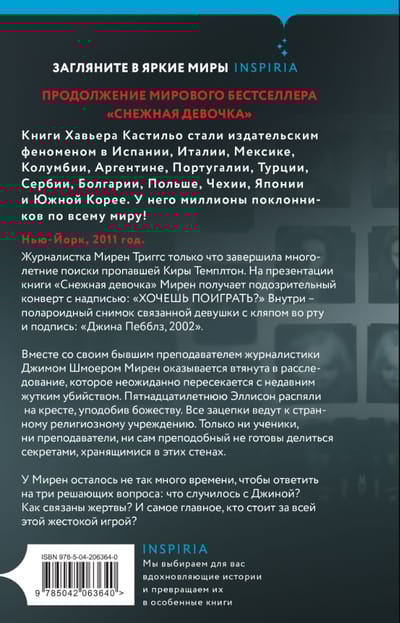 New York, 2011. Journalist Miren Triggs has just completed a multi-year search for missing Keira Templeton. At the presentation of the book "Snow Girl" Miren receives a suspicious envelope with the inscription "Do you want to play?". Inside is a Polaroid shot of a bound girl with a gag in her mouth and the caption "Gina Pebbles, 2002."