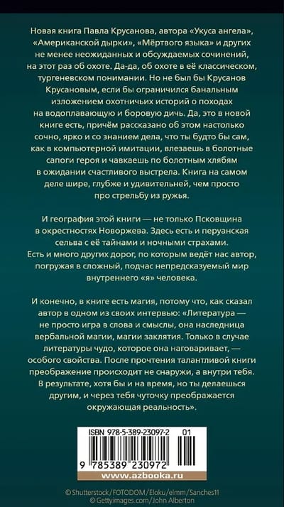A new book by Pavel Krusanov, author of "Angel's Bite," "American Hole," "Dead Language," and other equally unexpected and discussed works, this time about hunting. Yes, hunting in its classic, Turgenevian sense. But Krusanov wouldn't be Krusanov if he limited himself to banal recountings of hunting stories about waterfowl and forest game expeditions.
