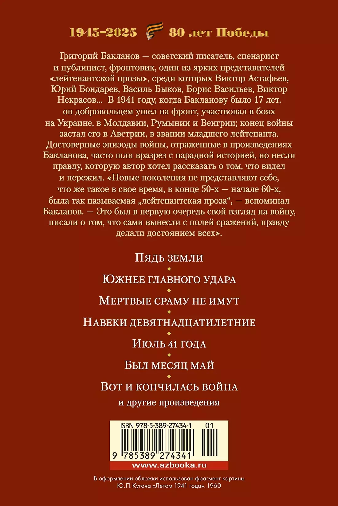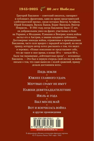 This edition includes the most famous works of Grigory Baklanov, written in different years, including the early war stories “South of the Main Attack” and “A Span of Land,” the novel “July 1941,” the stories “It Was the Month of May,” “And So the War Ended,” and “Nadya.”