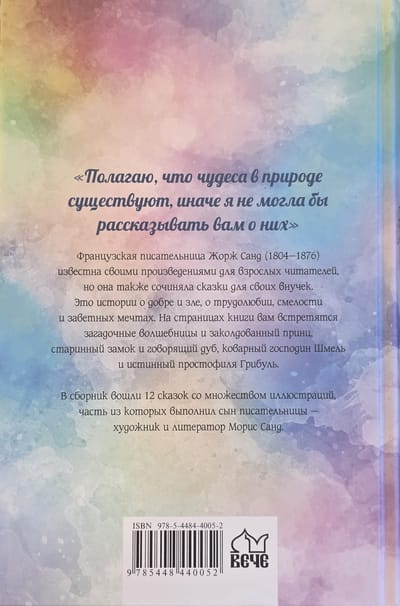 The French writer George Sand (1804-1876) is known for her works for adult readers, but she also wrote fairy tales for her granddaughters. These are stories about good and evil, hard work, courage and cherished dreams. On the pages of the book you will meet mysterious sorceresses and an enchanted prince, an ancient castle and a talking oak tree, the insidious Mr. Bumblebee and the true simpleton Griboul.