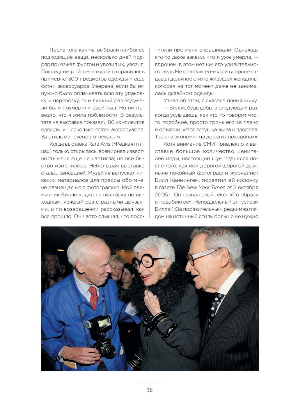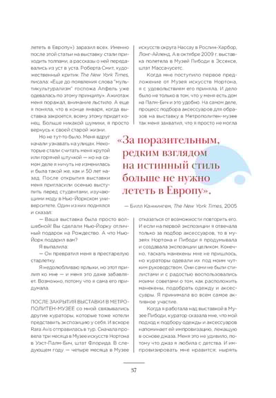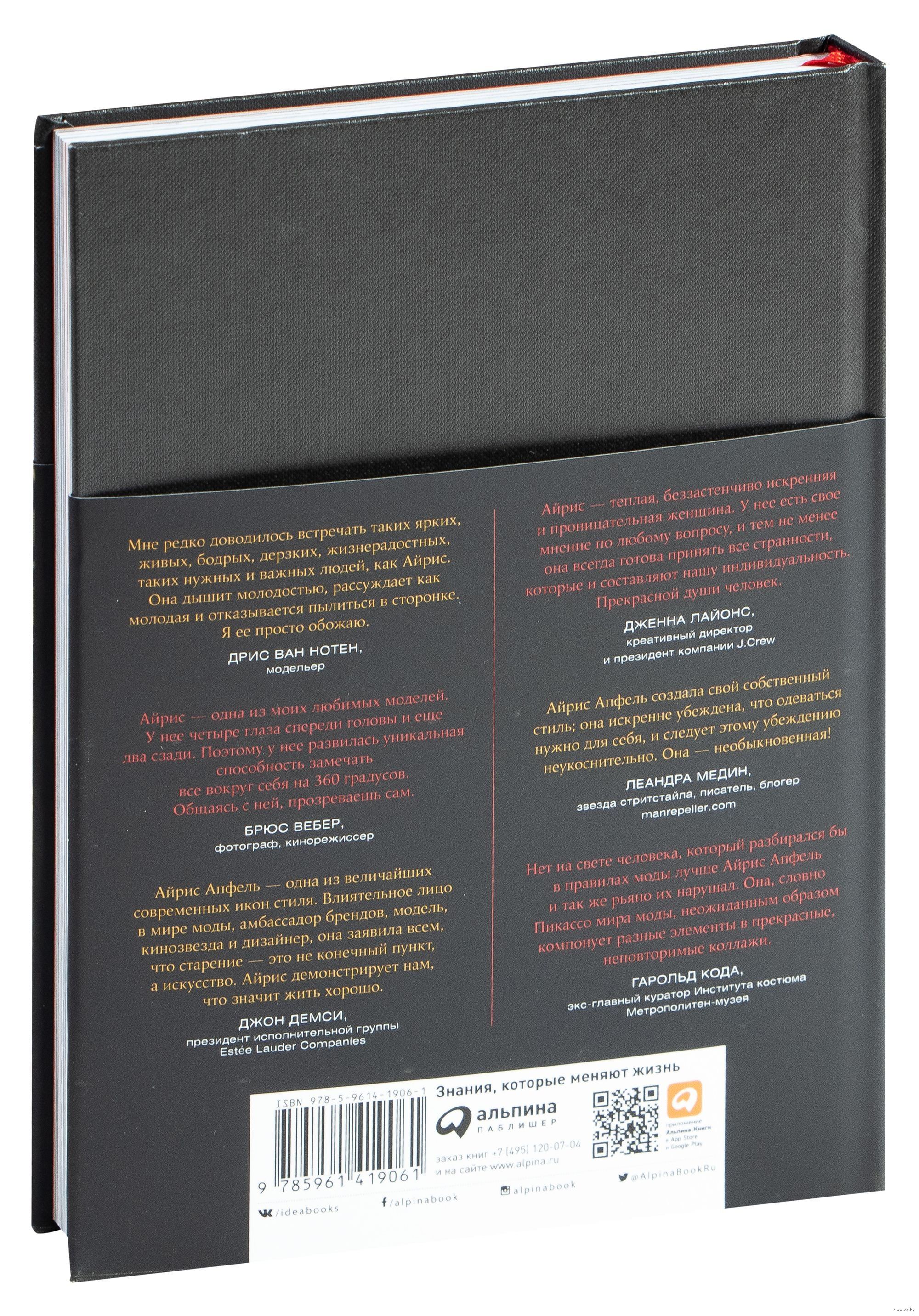 Iris Apfel is the muse of world designers, the owner of an incredible closet and a collection of unusual jewelry. One of the most extravagant personalities in the world of fashion and "the first lady of textiles" lives her life the way she sees fit, putting aside thoughts of age "decency" and infecting everyone with whom she communicates with optimism. Movies are made about her and constantly written about in glossies, Mattel produces Barbie in her images. Iris has millions of fans all over the world. In her 97th year, she has a contract with IMG agency, working with Bella Hadid, Gisele Bündchen and other top models. She is idolized by Dries van Noten, Bruce Weber, Kanye West and all the celebrities. The most amazing thing is that Iris never sought popularity, and became a style icon by chance. Iris Apfel's book is as bright and beautiful as its author. It contains advice and life rules, cases from childhood, stories from the present, descriptions of outfits, fabrics and accessories, historical events Iris participated in, reflections on life, love and people, essays on style and discussions on a variety of topics. The pages, each of which is worthy to hang in a frame on the wall, are decorated with photographs from Iris's personal archive, as well as works by the best photographers and artists of the fashion world.
