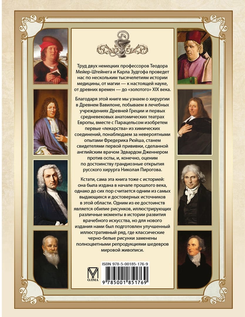 The work of two German professors, Theodor Meyer-Steinegg and Karl Sudhoff, will take us through several millennia of medical history, from magic to real science, from ancient times to the "golden" 19th century. Thanks to this book, we will learn about surgery in Ancient Babylon, visit medical institutions in Ancient Greece and the first medieval anatomical theaters in Europe, invent the first "medicines" from chemical compounds together with Paracelsus, observe the incredible experiments of Frederick Ruysch, witness the first vaccination against smallpox made by the English doctor Edward Jenner, and, of course, appreciate the grandiose discoveries of the Russian surgeon Nikolai Pirogov. By the way, this book itself also has a history: it was published at the beginning of the last century, but is still considered one of the most outstanding and reliable sources in this field. One of its advantages is the abundance of drawings illustrating various moments in the history of the development of medical art, but for the new edition we have prepared an improved illustrative series, where the classic black and white drawings are replaced by full-color reproductions of masterpieces of world painting.