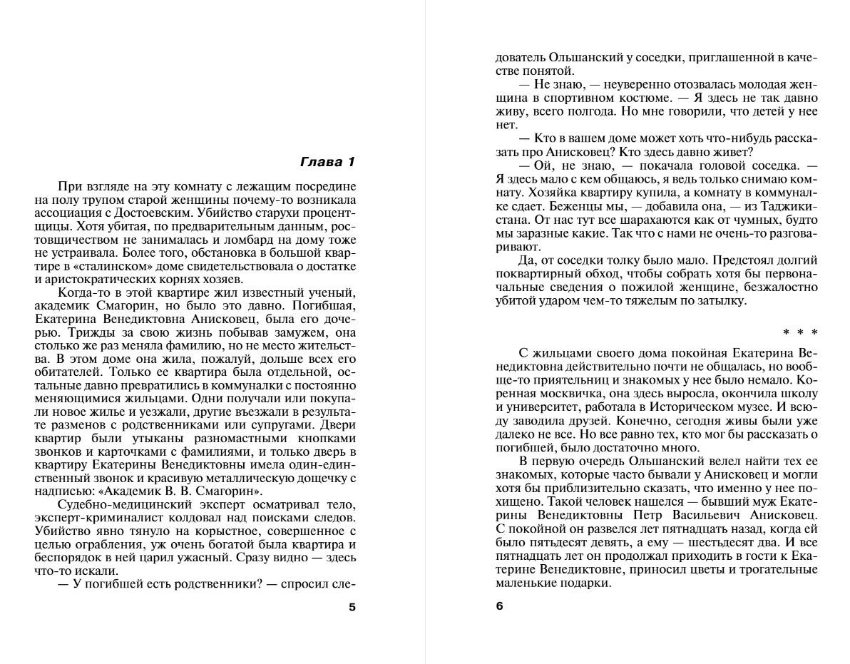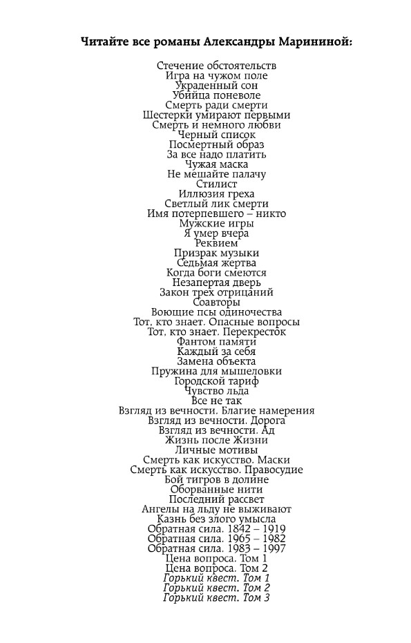 Someone is secretly and intently investigating the lives of four children crippled by their mother. One murder, a second, a third... And all of them are somehow connected to this unfortunate family. What secret lies hidden in these people's past? In the past? Nastya Kamenskaya wonders, analyzing the circumstances of the crimes. As always, there's no time to think—a girl has been kidnapped right from the hospital, and the remaining children are in danger. Where is the source of this threat? A flash of insight, like a flash of lightning, suddenly illuminates the situation, which turns out to be far more terrifying than Nastya imagined...