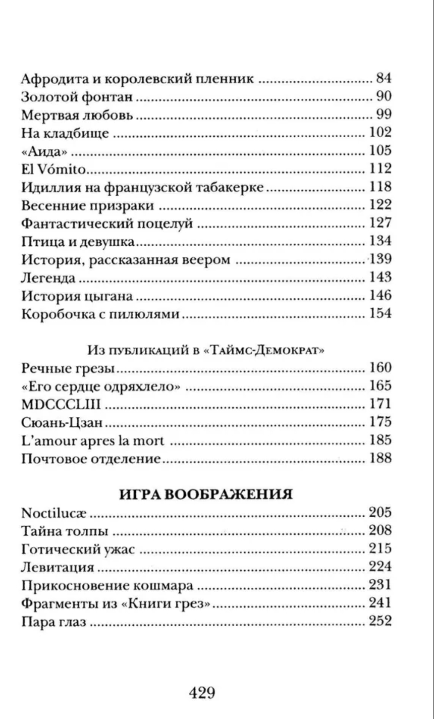 Exquisite, imbued with a "longing for other existences" (as Fyodor Sologub put it), these darkly romantic stories feature cursed jewels, Creole witchcraft, tragic love that knows no bounds even in death, exotic lands, metempsychosis, reincarnation, and other exciting themes. The writer explores the nature of the supernatural fear evoked in us by dark legends and the oppressive architecture of Gothic cathedrals.