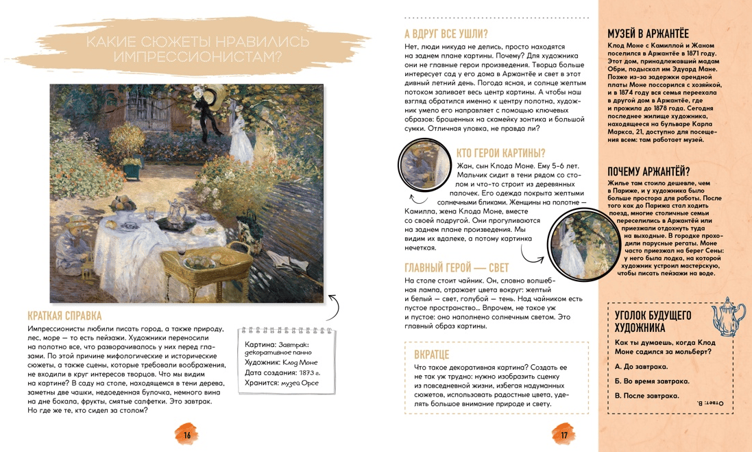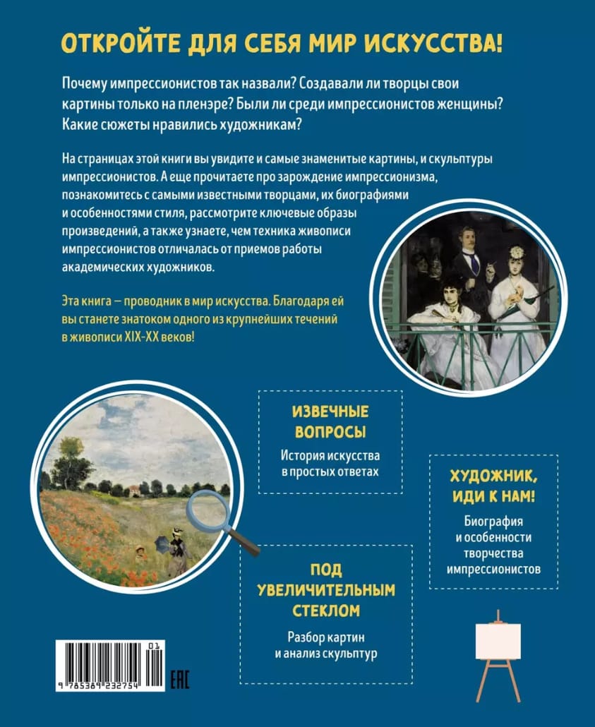 Why were the Impressionists so named? Did the artists create their paintings only in plein air? Were there any women among the Impressionists? What subjects did the artists like? On the pages of this book you will see the most famous paintings and sculptures of the Impressionists. And also read about the birth of Impressionism, get acquainted with the most famous creators, their biographies and features of the style, consider the key images of works, and also learn how the technique of painting Impressionists differed from the methods of work of academic artists. This book is a guide to the world of art. Thanks to it, you will become a connoisseur of one of the largest movements in painting of the XIX-XX centuries.