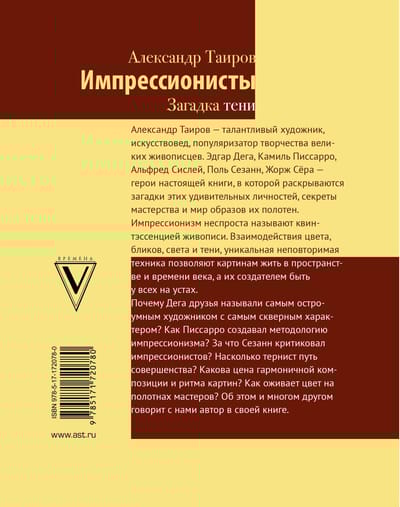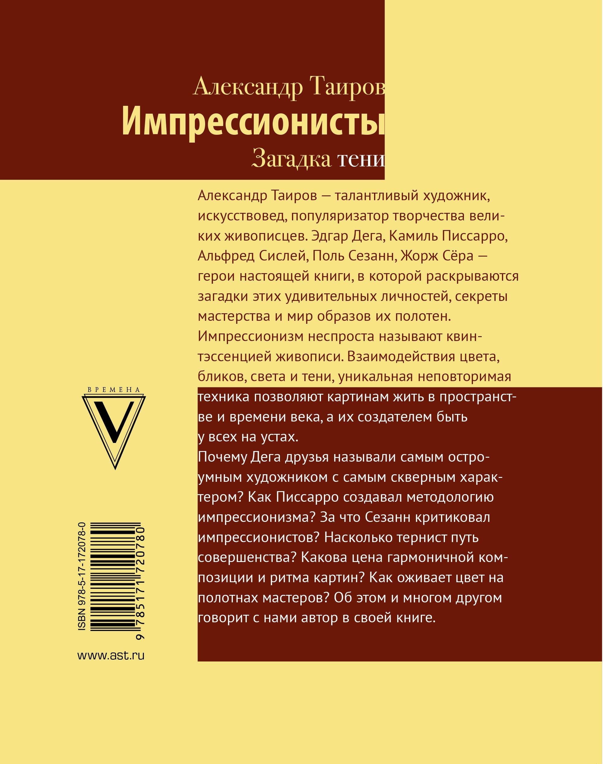 Alexander Tairov is a talented artist, art critic, popularizer of the works of great painters. Edgar Degas, Camille Pissarro, Alfred Sisley, Paul Cezanne, Georges Seurat are the heroes of this book, which reveals the mysteries of these amazing personalities, the secrets of their craft and the world of images of their canvases.