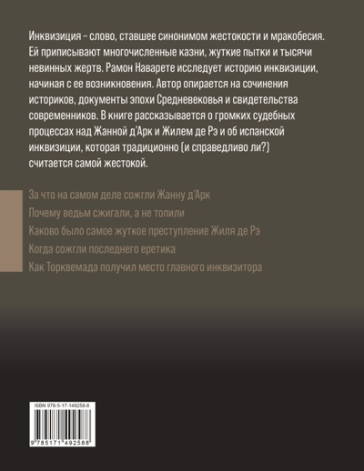 In his book, the author objectively examines this phenomenon and describes in detail the history of the Inquisition, starting from its origin. The author relies on the works of historians, documents from the Middle Ages and the testimonies of contemporaries. He tells about the high-profile trials of Joan of Arc and Gilles de Rae, and about the Spanish Inquisition, which is traditionally (and rightly?) considered the most brutal.